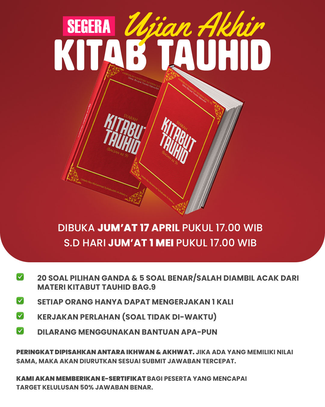 Sebagaimana biasa, peserta yang berhasil mencapai target kelulusan dengan minimal 50% jawaban benar akan mendapatkan e-sertifikat dari HijrahApp sebagai bentuk apresiasi atas kesungguhan dalam menuntut ilmu.