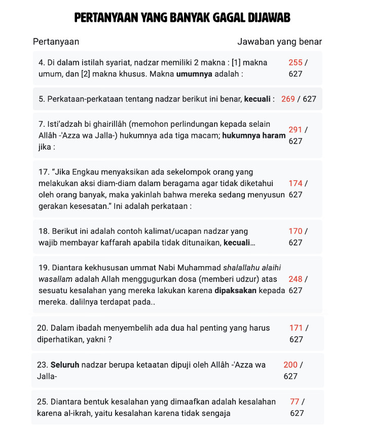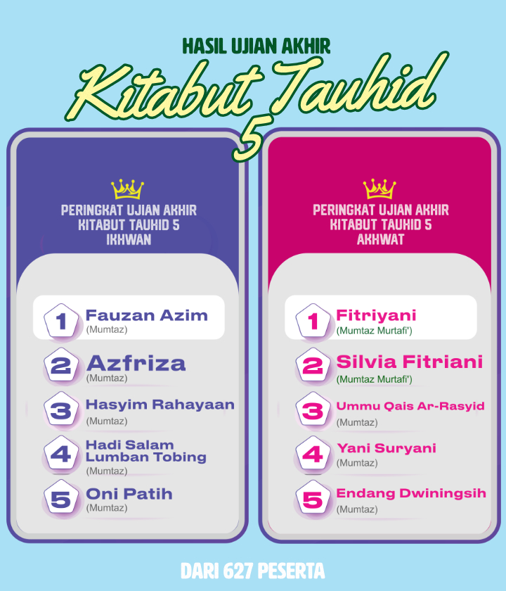 Alhamdulillah, total 627 peserta mengikuti ujian akhir – kitabut tauhid bag.5 ini.