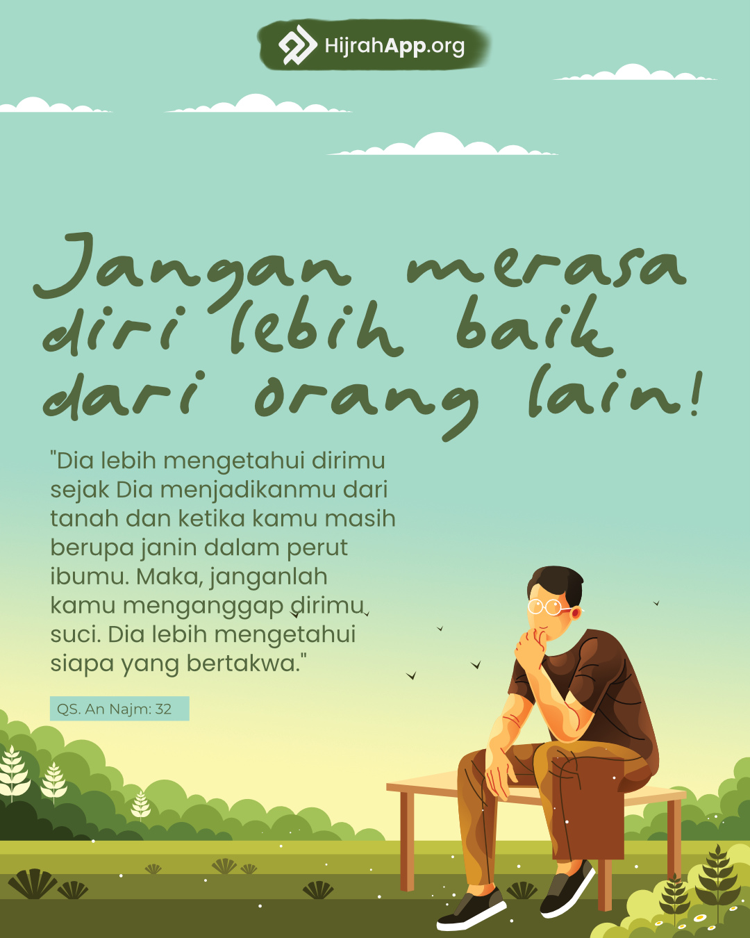 “Dan janganlah kamu memalingkan mukamu dari manusia (karena sombong) dan janganlah kamu berjalan di muka bumi dengan angkuh. Sesungguhnya Allah tidak menyukai orang-orang yang sombong lagi membanggakan diri.” (QS. Luqman:18)