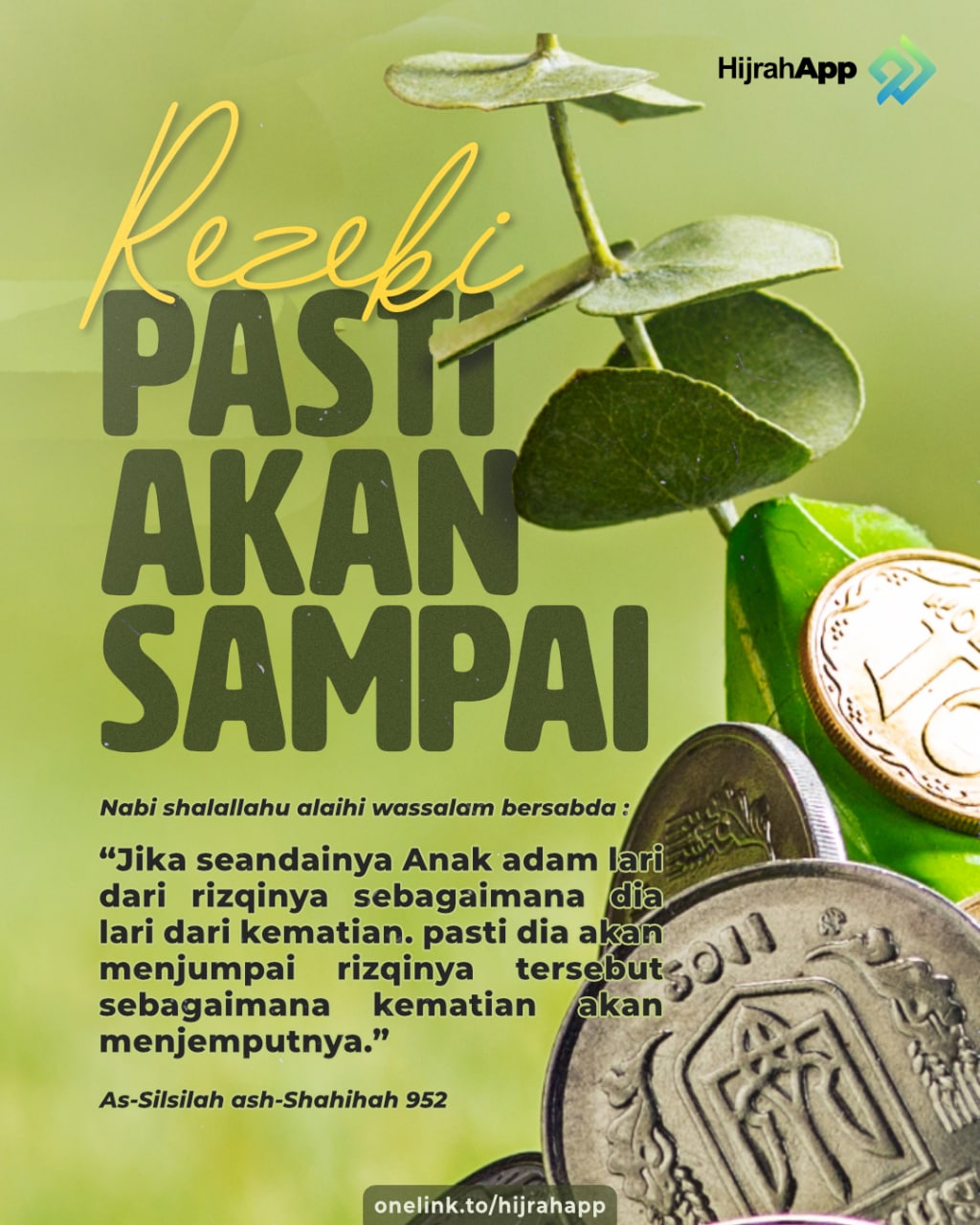 “Tiada suatu bencana pun yang menimpa di bumi dan (tidak pula) pada dirimu sendiri melainkan telah tertulis dalam kitab (Lauhul Mahfuzh) sebelum Kami menciptakannya. Sesungguhnya yang demikian itu adalah mudah bagi Allah. (Kami jelaskan yang demikian itu) supaya kamu jangan berduka cita terhadap apa yang luput dari kamu, dan supaya kamu jangan terlalu gembira terhadap apa yang diberikan-Nya kepadamu…” (QS. Al Hadiid:22-23).[13]