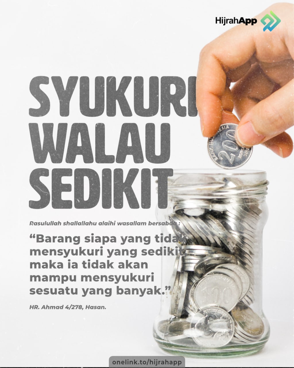 “Barang siapa yang tidak mensyukuri yang sedikit, maka ia tidak akan mampu mensyukuri sesuatu yang banyak.” (HR. Ahmad, 4/278. Syaikh Al Albani mengatakan bahwa hadits ini hasan sebagaimana dalam As Silsilah Ash Shohihah no. 667). Hadits ini benar sekali. Bagaimana mungkin seseorang dapat mensyukuri rizki yang banyak, rizki yang sedikit dan tetap terus Allah beri sulit untuk disyukuri? Bagaimana mau disyukuri? Sadar akan nikmat tersebut saja mungkin tidak terbetik dalam hati.