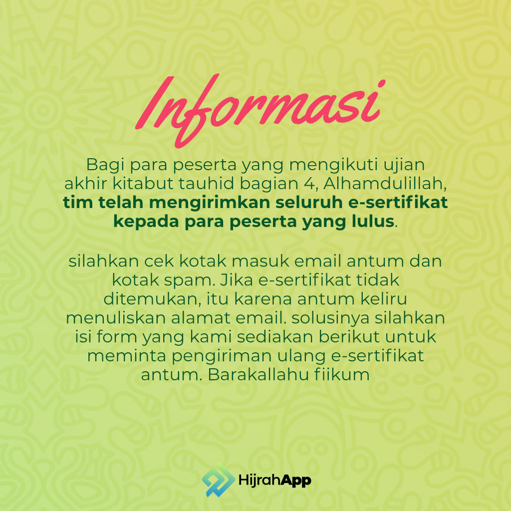 catatan: Bagi peserta yang lulus, seluruh e-sertifikat akan kami kirim ke email antum mulai tanggal 1 April 2023. Insyaallah, akan membutuhkan maksimal 7 hari kerja untuk mengirim seluruh e-sertifikat kepada peserta yang lulus. terimakasih