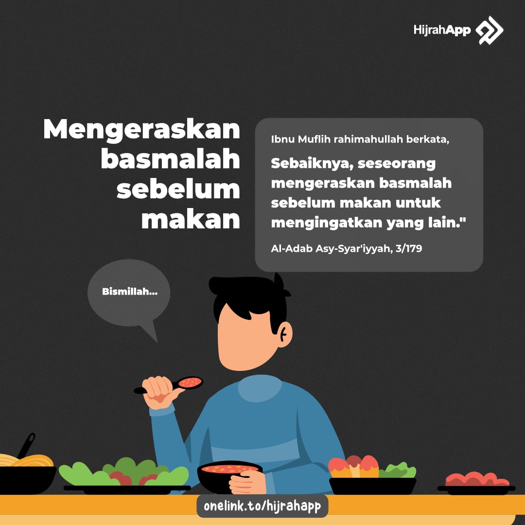 - Memulai minum dengan membaca basmallah.Diantara sunnah Nabi adalah mengucapkan basmallah sebelum minum. Hal ini berdasarkan hadits yang memerintahkan membaca ‘bismillah’ sebelum makan. Bacaan bismillah yang sesuai dengan sunnah adalah cukup dengan bismillah tanpa tambahan ar-Rahman dan ar-Rahim.Dari Amr bin Abi Salamah, Rasulullah shallallahu ‘alaihi wa sallam bersabda, “Wahai anakku, jika engkau hendak makan ucapkanlah bismillah, makanlah dengan tangan kananmu dan makanlah makanan yang berada di dekatmu.” (HR Thabrani dalam Mu’jam Kabir)Dalam silsilah hadits shahihah, 1/611 Syaikh al-Albani mengatakan, “Sanad hadits ini shahih menurut persyaratan Imam Bukhari dan Imam Muslim)Wahai ibu, jangan lupa untuk mengingatkan anak-anak kita untuk membaca ‘bismillah’ ketika hendak minum, agar setan tidak ikut serta menikmati makanan dan minuman yang sedang kita konsumsi.