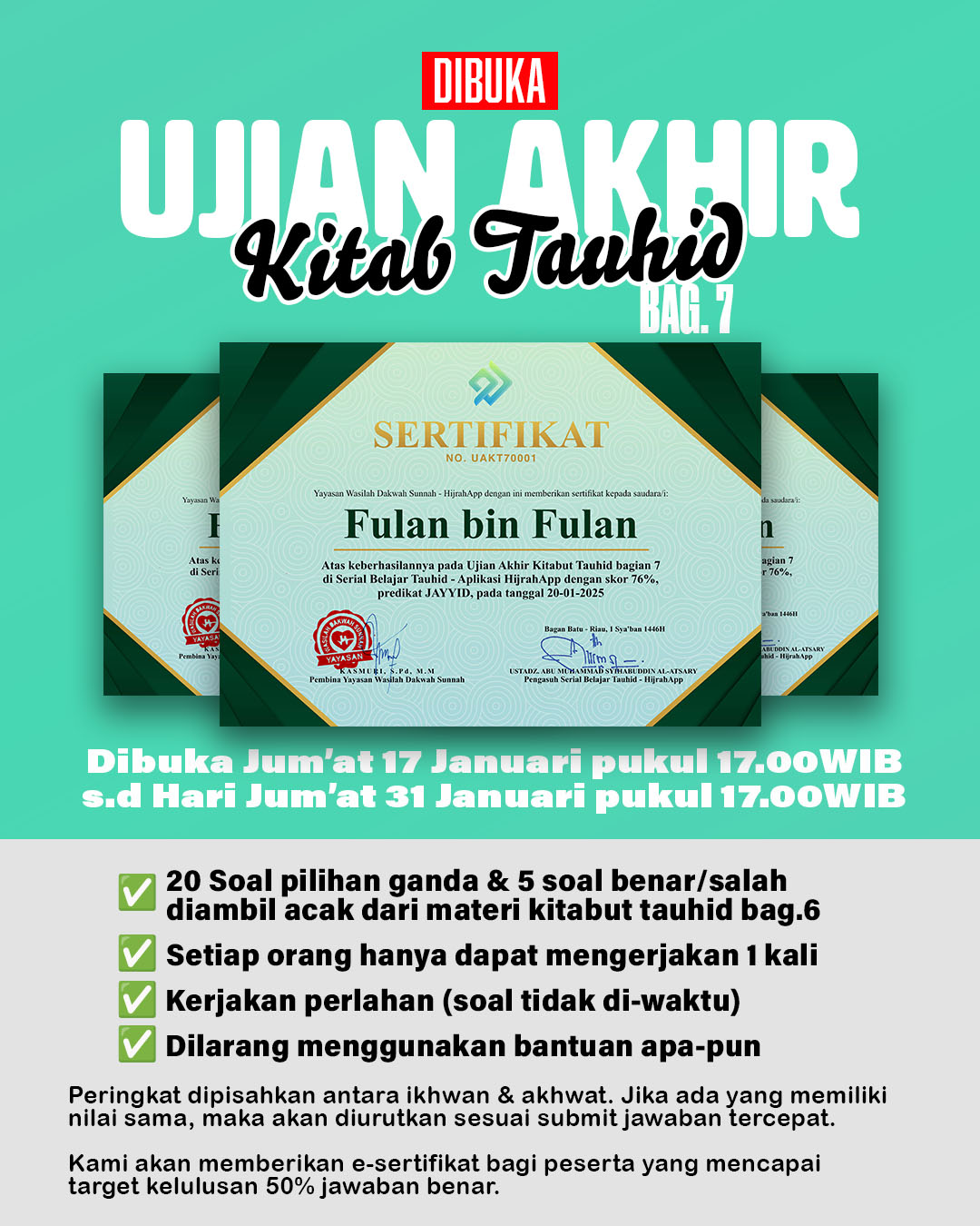 *Bagi peserta yang lulus, e-sertifikat akan kami kirimkan maksimal dalam 2 pekan kedepan. silahkan periksa kotak masuk email antum secara berkala.