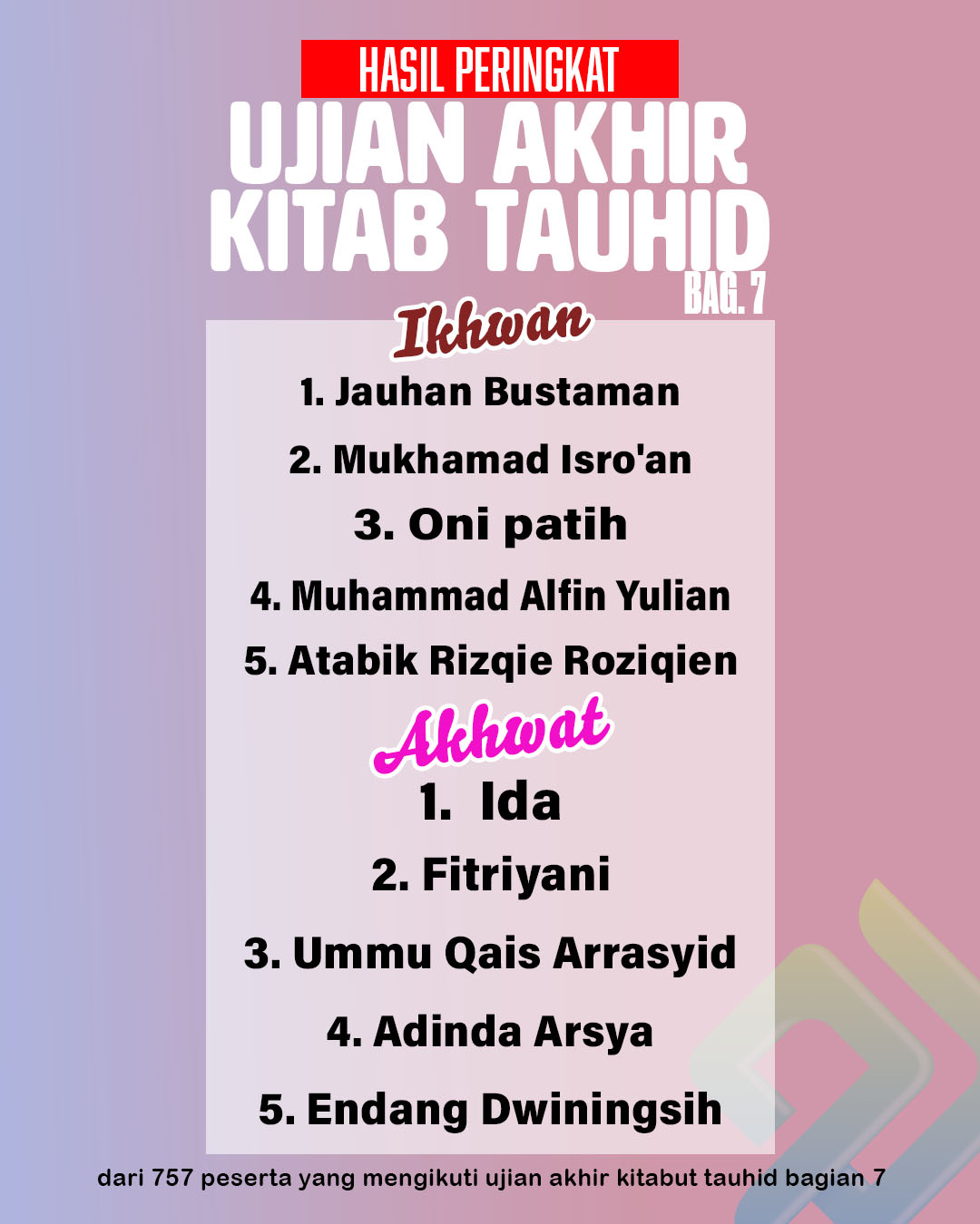 Alhamdulillah, total 757 peserta mengikuti ujian akhir – kitabut tauhid bag.7 ini.