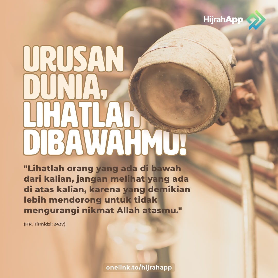 “Pandanglah orang yang berada di bawahmu (dalam masalah harta dan dunia) dan janganlah engkau pandang orang yang berada di atasmu (dalam masalah ini). Dengan demikian, hal itu akan membuatmu tidak meremehkan nikmat Allah padamu.” (HR. Bukhari dan Muslim)