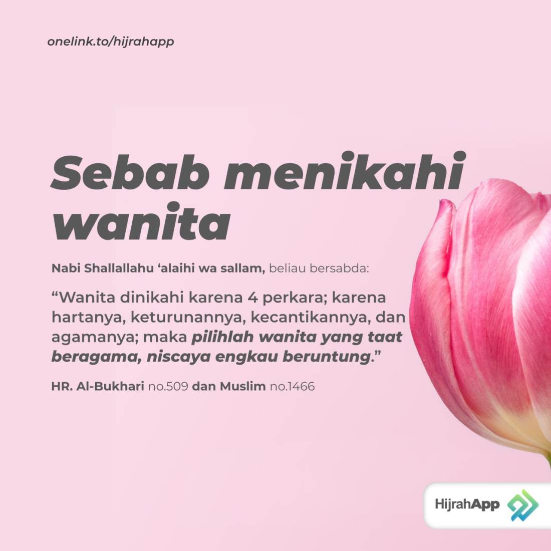 “Perempuan itu dinikahi karena empat faktor yaitu agama, martabat, harta dan kecantikannya. Pilihlah perempuan yang baik agamanya. Jika tidak, niscaya engkau akan menjadi orang yang merugi”.[3]