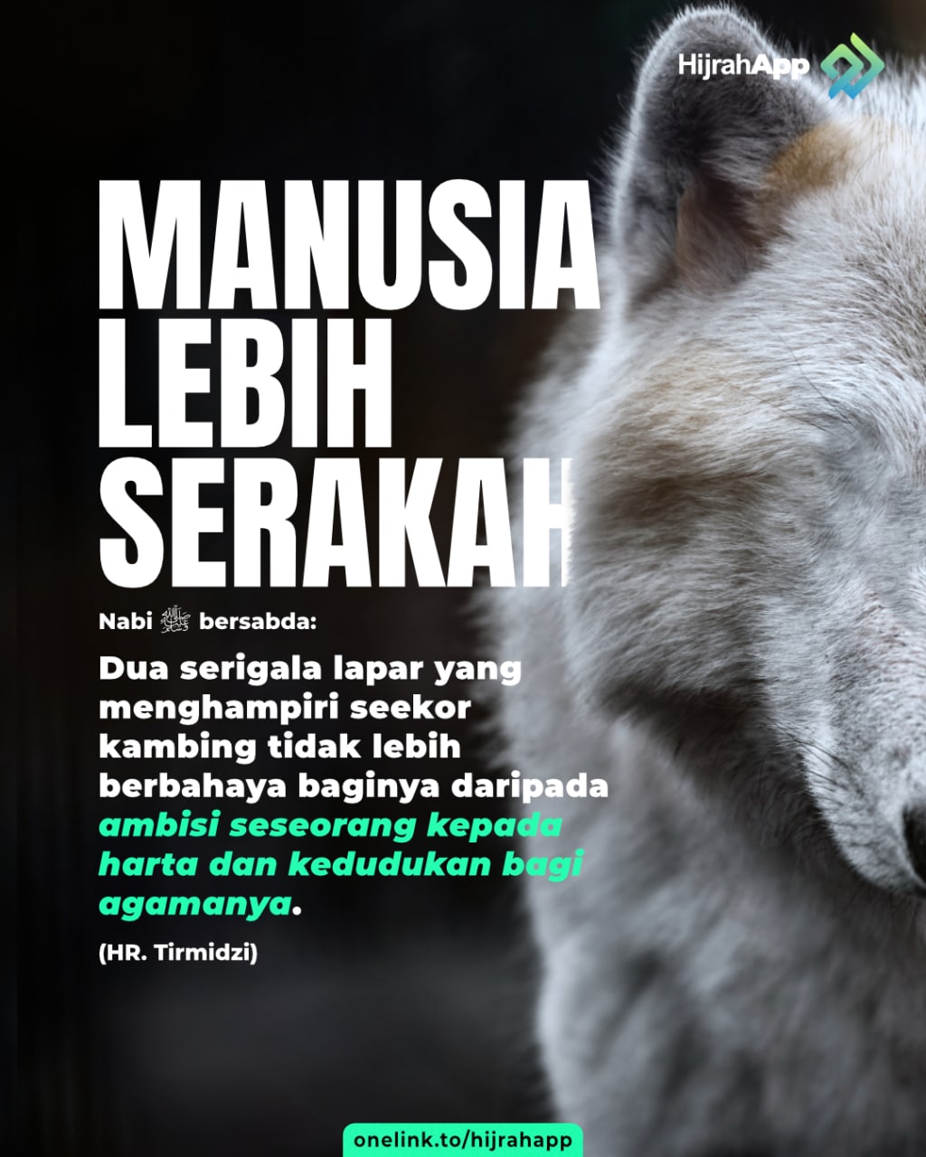 Dalam sebuah hadis disebutkan bahwa manusia lebih serakah daripada dua serigala lapar yang akan menerkam kambing. Rasulullah shallallahu ‘alaihi wasallam bersabda,