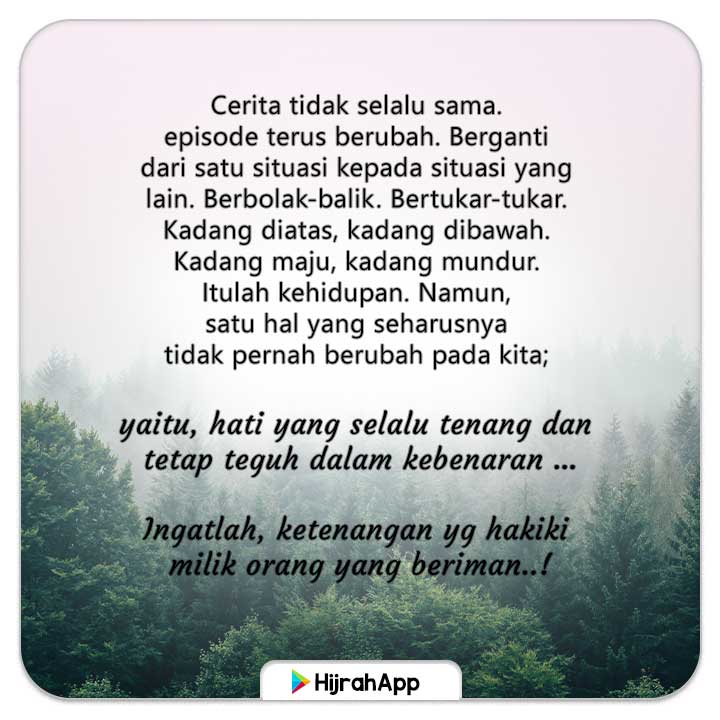 Cerita tidak selalu sama. Episode terus berubah. Berganti dari satu situasi kepada situasi yang lain. Berbolak-balik. Bertukar-tukar. Kadang diatas, kadang dibawah. Kadang maju, kadang mundur. Itulah kehidupan. Namun, satu hal yang seharusnya tidak pernah berubah pada kita; yaitu, hati yang selalu tenang dan tetap teguh dalam kebenaran …