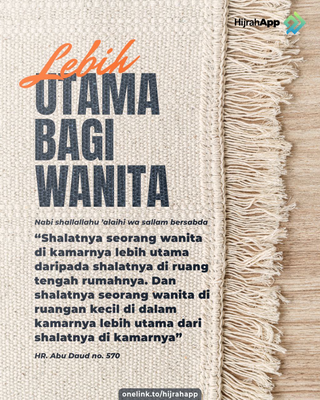 “Shalat seorang wanita di kamar khusus untuknya lebih afdhal daripada shalatnya di ruang tengah rumahnya. Shalat wanita di kamar kecilnya (tempat simpanan barang berharganya, pen.) lebih utama dari shalatnya di kamarnya.” (HR. Abu Daud, no. 570. Al-Hafizh Abu Thahir mengatakan bahwa sanad hadits ini dha’if. Syaikh Al-Albani mengatakan bahwa hadits ini shahih. Lihat pengertian hadits ini dalam ‘Aun Al-Ma’bud, 2: 225).