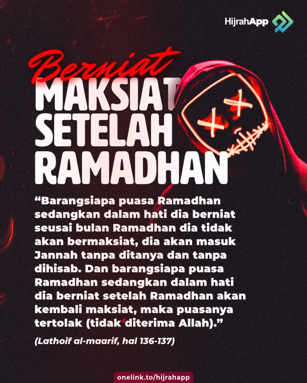 “Barangsiapa puasa Ramadhan sedangkan dalam hati dia berniat seusai bulan Ramadhan dia tidak akan bermaksiat, dia akan masuk Jannah tanpa ditanya dan tanpa dihisab. Dan barangsiapa puasa Ramadhan sedangkan dalam hati dia berniat setelah Ramadhan akan kembali maksiat, maka puasanya tertolak (tidak diterima Allah).” (Lathoif al-maarif, hal 136-137)