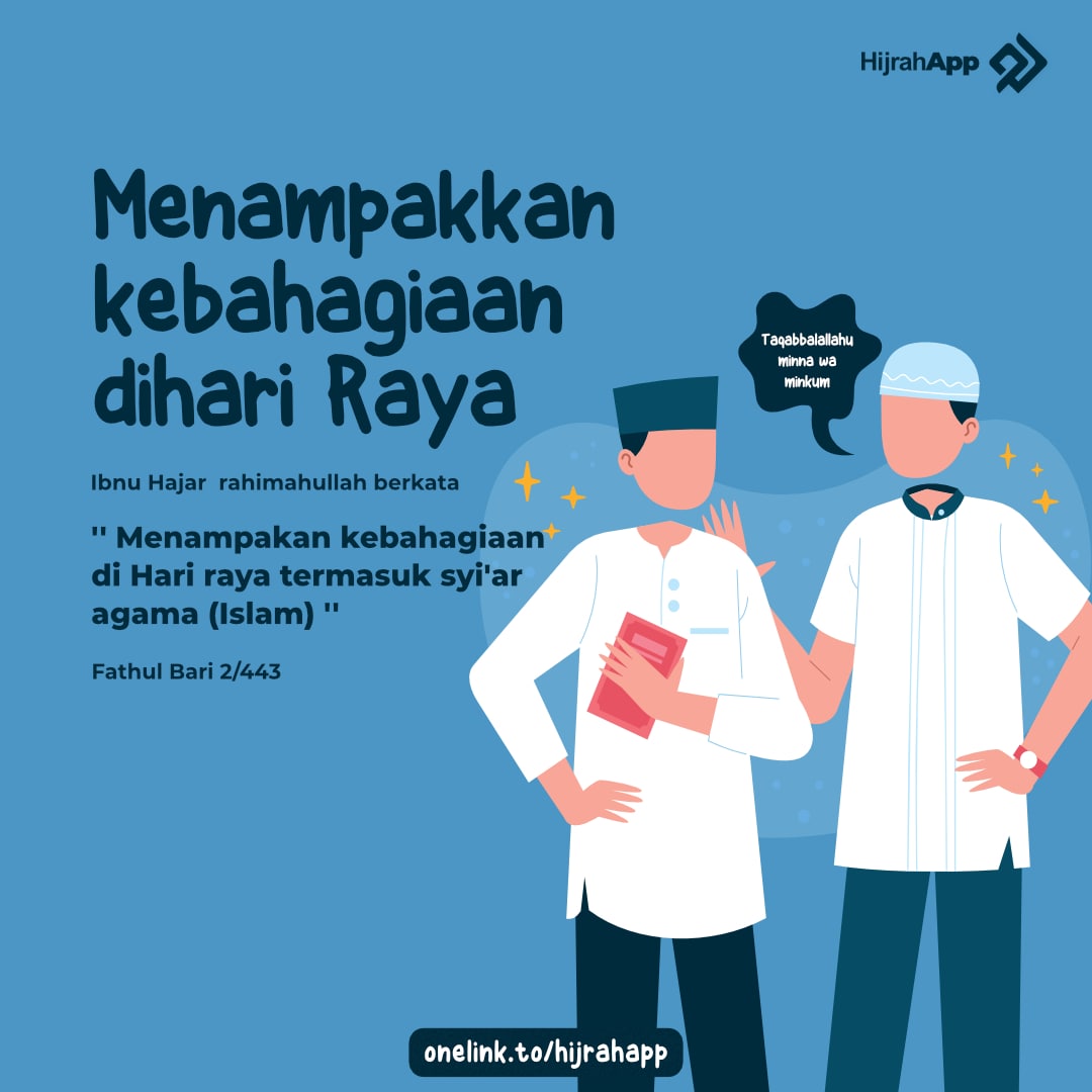 Ibnu Hajar al ‘Asqalany berkata, “Dalam hadis ini terdapat petunjuk bahwa menampakkan kebahagiaan pada hari raya termasuk syi’ar agama.” (Fathul Baary 2/443 dinukil dari Syarh Umdah al Fiqh, 1/410)