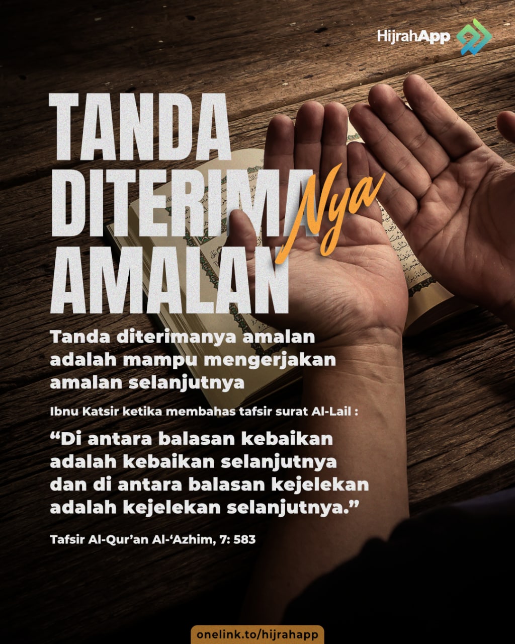 Berarti tanda amalan Ramadhan kita diterima adalah menjadi lebih baik selepas Ramadhan atau minimal menjaga kebaikan yang telah ada. Contoh kebaikan yang dilakukan setelah Ramadhan adalah puasa Syawal. Tanda amalan kita di bulan Ramadhan tidak diterima adalah setelah Ramadhan tidak lagi ada kebaikan, bahkan sampai meninggalkan kewajiban seperti kewajiban shalat lima waktu.