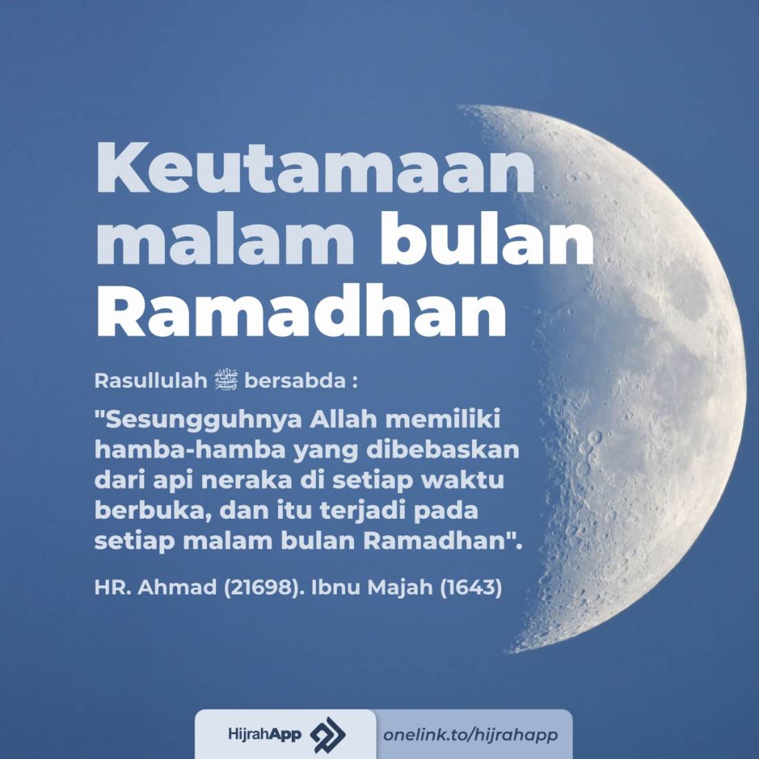 “Sesungguhnya Allah Tabaraka wa Ta’ala memberikan kebebasan dari siksa neraka pada setiap malam –yakni di bulan Ramadan- dan sesungguhnya setiap muslim pada waktu siang dan malam memiliki doa yang terkabul ( mustajabah)”.