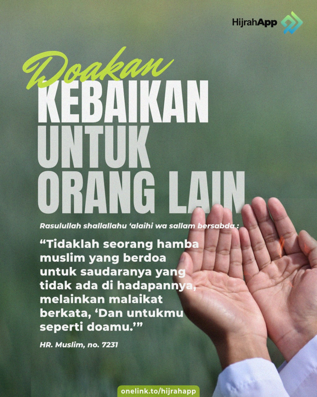 “Sesungguhnya do’a seorang muslim kepada saudaranya di saat saudaranya tidak mengetahuinya adalah doa’a yang mustajab (terkabulkan). Di sisi orang yang akan mendo’akan saudaranya ini ada malaikat yang bertugas mengaminkan do’anya. Tatkala dia mendo’akan saudaranya dengan kebaikan, malaikat tersebut akan berkata: Amin. Engkau akan mendapatkan semisal dengan saudaramu tadi.”
