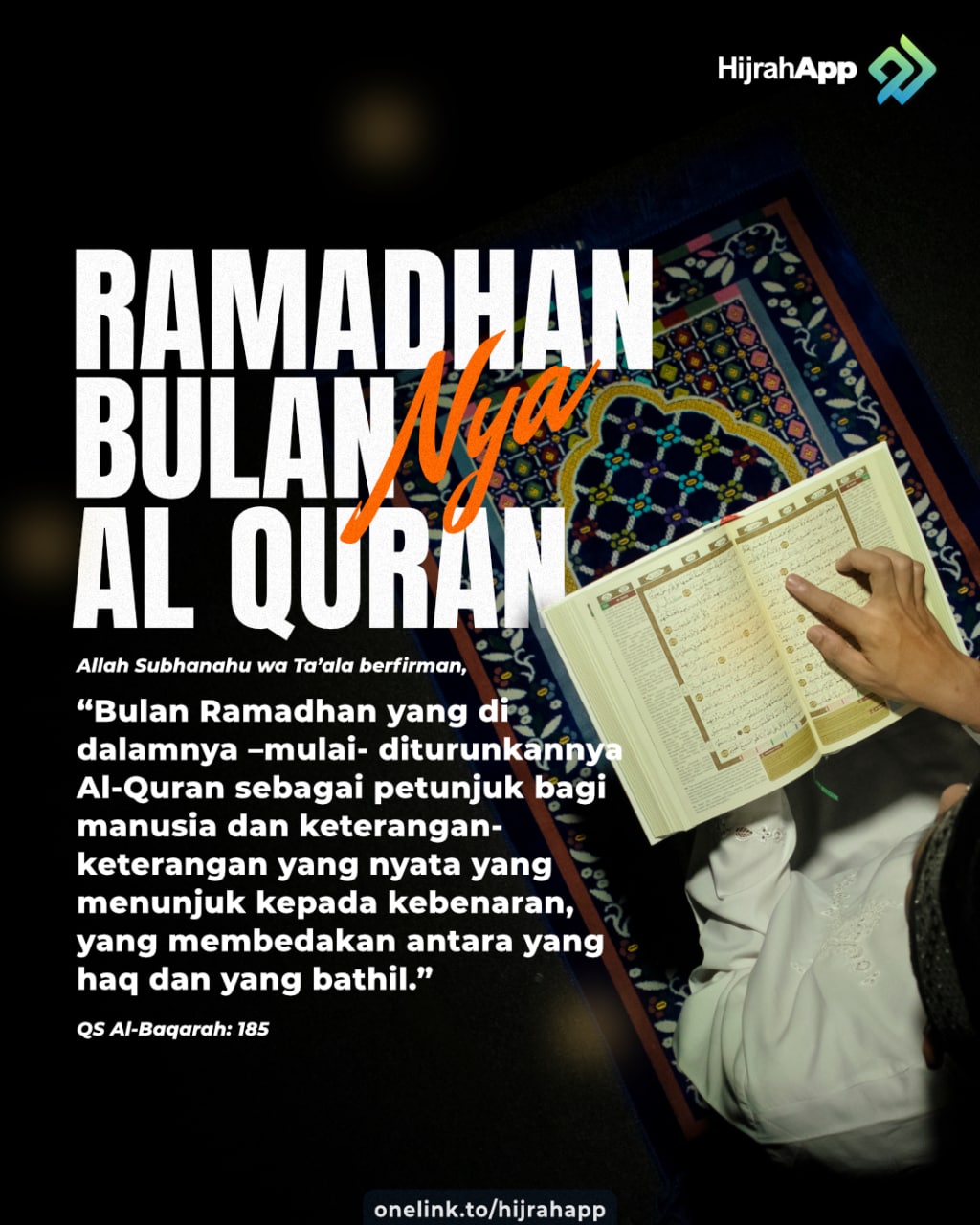 “Bulan Ramadhan yang di dalamnya –mulai- diturunkannya Al-Quran sebagai petunjuk bagi manusia dan keterangan-keterangan yang nyata yang menunjuk kepada kebenaran, yang membedakan antara yang haq dan yang bathil.” (QS Al-Baqarah: 185)