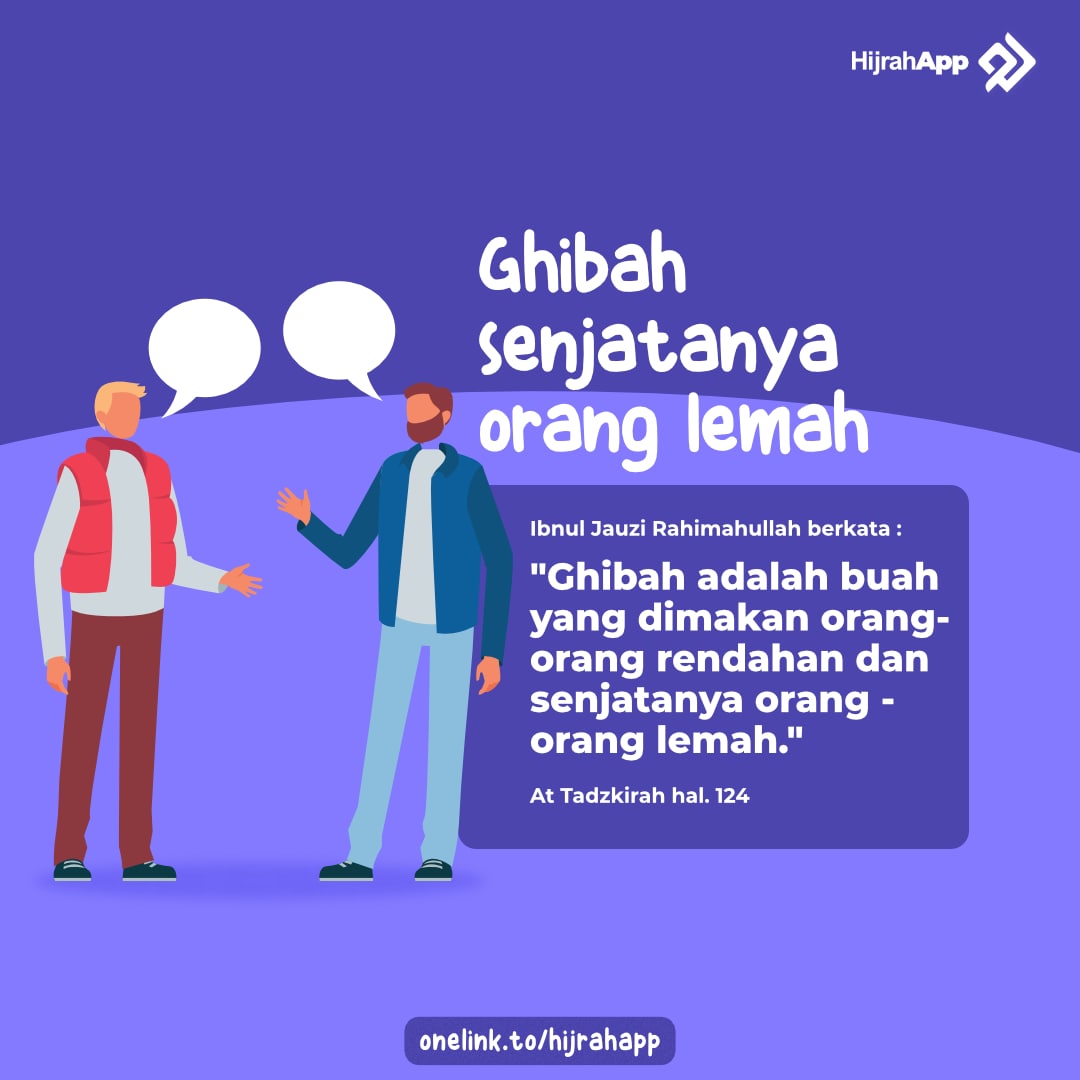 Dari Abu Huroiroh radliyallahu ‘anhu bahwsanya Rasulullah shallallahu ‘alaihi wa sallam bersabda : Tahukah kalian apakah ghibah itu? Sahabat menjawab : Allah dan Rosul-Nya yang lebih mengetahui. Nabi shallallahu ‘alaihi wa sallam berkata : “Yaitu engkau menyebutkan sesuatu yang tidak disukai oleh saudaramu”, Nabi shallallahu ‘alaihi wa sallam ditanya : Bagaimanakah pendapatmu jika itu memang benar ada padanya ? Nabi shallallahu ‘alaihi wa sallam menjawab : “Kalau memang sebenarnya begitu berarti engkau telah mengghibahinya, tetapi jika apa yang kau sebutkan tidak benar maka berarti engkau telah berdusta atasnya”.[11]