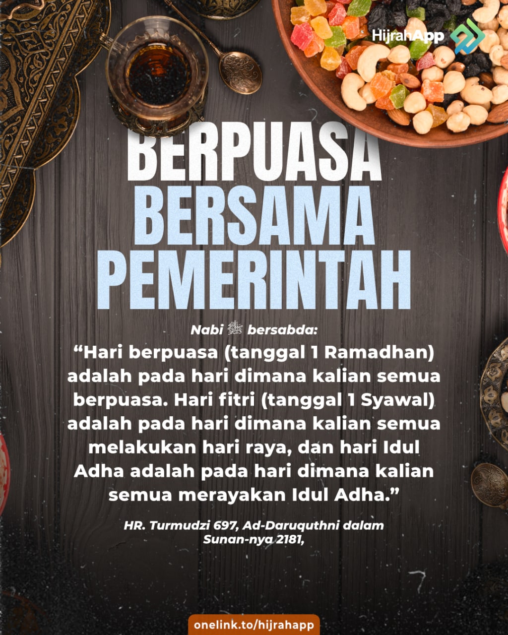 “Dari Abu Hurairah Radhiallahu’anhu, bahwasanya Nabi Shallallahu’alaihi Wasallam bersabda: ‘Hari puasa adalah hari ketika orang-orang berpuasa, Idul Fitri adalah hari ketika orang-orang berbuka, dan Idul Adha adalah hari ketika orang-orang menyembelih‘” (HR. Tirmidzi 632, Ad Daruquthni 385).