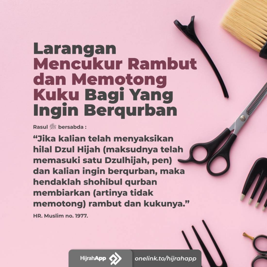 “Haram bagi mereka yang ingin melaksanakan qurban baik laki-laki maupun wanita, memotong rambut badannya, memorong kuku atau bagian kulitnya (misalnya kulit dekat kuku). Sama saja baik itu rambut kepala, kumis, rambut kemaluan atau rambut ketiak serta rambut lainnya di badannya.”[3]