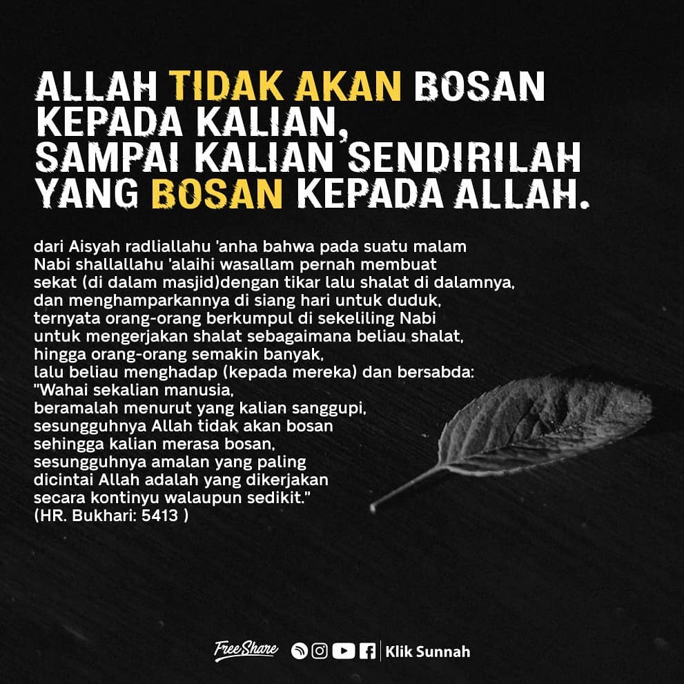 ”Wahai sekalian manusia, lakukanlah amalan sesuai dengan kemampuan kalian. Karena Allah tidaklah bosan sampai kalian merasa bosan. (Ketahuilah bahwa) amalan yang paling dicintai oleh Allah adalah amalan yang kontinu (ajeg) walaupun sedikit.”[8]