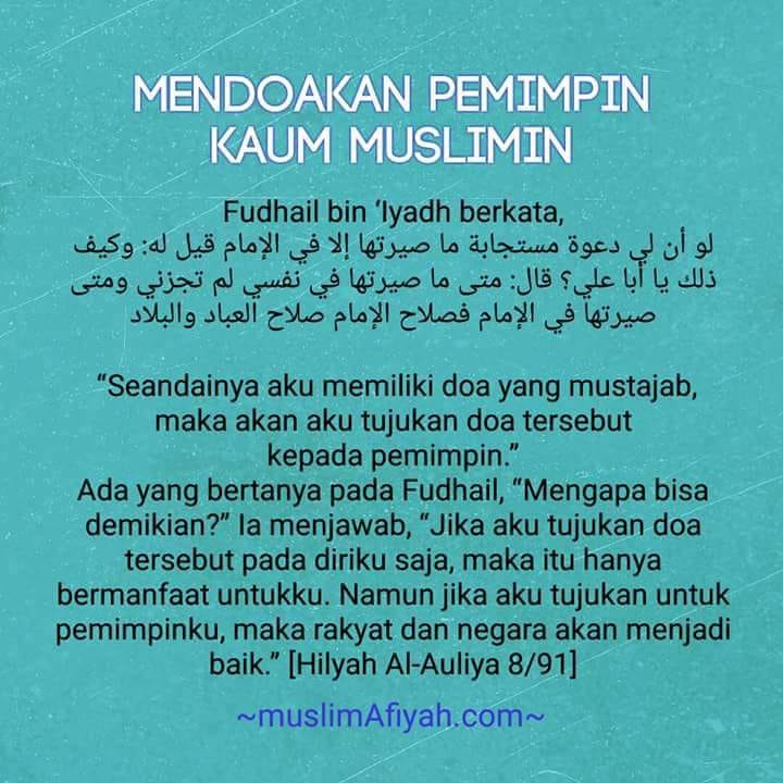 “Barangsiapa yang mencabut tangannya dari mentaati imam, maka dia kelak hari kiamat tidak memiliki argumen. Dan barangsiapa mati dalam kondisi memisahkan diri dari kelompok kaum muslimin, maka ia mati dalam kondisi Jahiliyah”. HR Ahmad