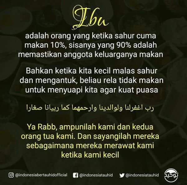 Semoga kita termasuk orang yang bisa berbakti kepada orang tua khususnya ibu. Semoga kita termasuk orang yang tidak melupakan jasa-jasa ibu kita. Semoga anak-istri dan pekerjaan kita tidak menyibukkan kita dan melalaikan kita untuk berbakti dan memberikan perhatian kepada ibu kita. Ingatlah di masa kecil kita sangat sering membuat susah orang tua terutama ibu kita, bersabarlah ketika berbakti kepada keduanya