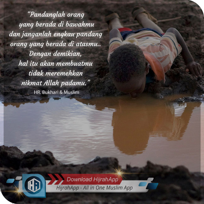 “Pandanglah orang yang berada di bawahmu (dalam masalah harta dan dunia) dan janganlah engkau pandang orang yang berada di atasmu (dalam masalah ini). Dengan demikian, hal itu akan membuatmu tidak meremehkan nikmat Allah padamu.” (HR. Bukhari dan Muslim)