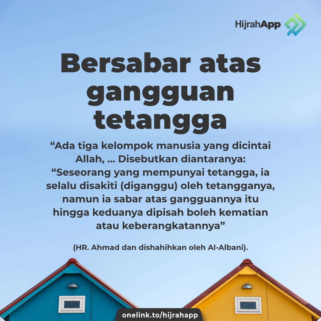 Rasulullah shallallahu ‘alaihi wassallam bersabda (yang artinya): “Ada tiga kelompok manusia yang dicintai Allah, … Disebutkan diantaranya: “Seseorang yang mempunyai tetangga, ia selalu disakiti (diganggu) oleh tetangganya, namun ia sabar atas gangguannya itu hingga keduanya dipisah boleh kematian atau keberangkatannya” (HR. Ahmad dan dishahihkan oleh Al-Albani).