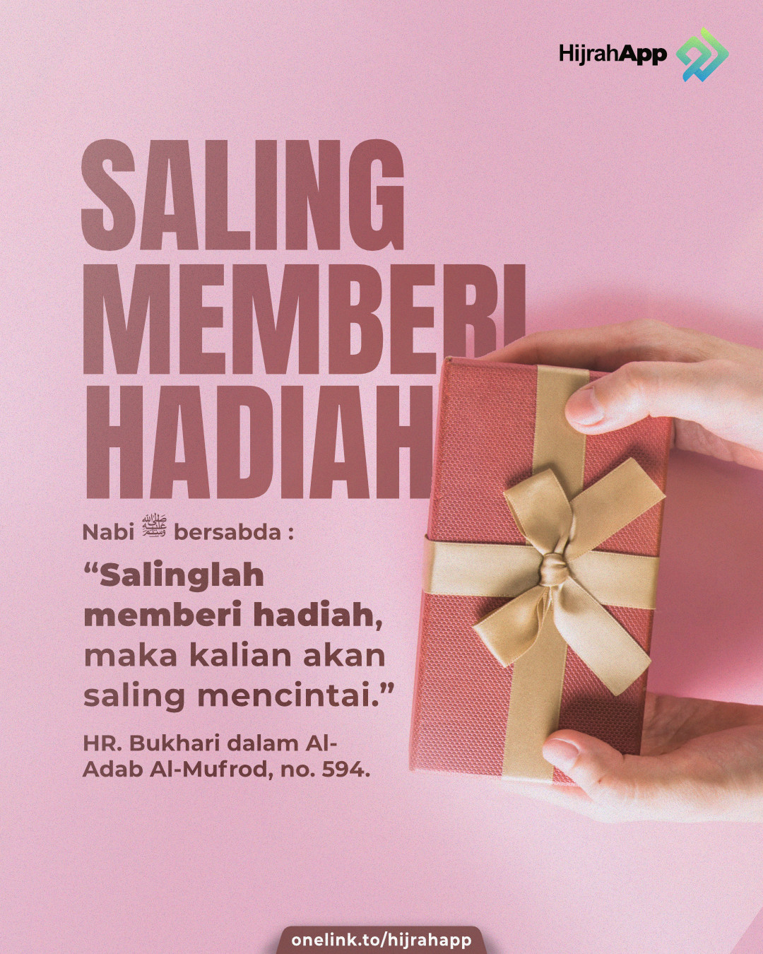 “Salinglah memberi hadiah, maka kalian akan saling mencintai.” (HR. Bukhari dalam Al-Adab Al-Mufrod, no. 594. Hadits ini dihasankan oleh Syaikh Al-Albani dalam Al-Irwa’, no. 1601. Syaikh Musthofa Al-‘Adawi dalam catatan kaki Fiqh Al-Akhlaq menyatakan bahwa sanad haditsnya hasan dengan syawahidnya)