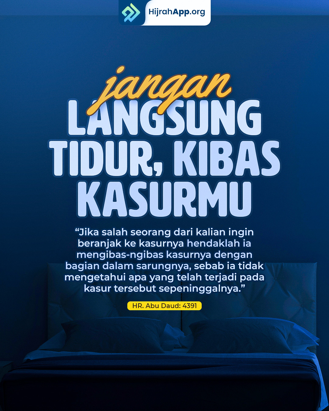 “Jika salah seorang di antara kalian akan tidur, hendaklah mengambil potongan kain dan mengibaskan tempat tidurnya dengan kain tersebut sambil mengucapkan, ‘bismillaah,’ karena ia tidak tahu apa yang terjadi sepeninggalnya tadi.” [HR. Al-Bukhari no. 6320, Muslim no. 2714, at-Tirmidzi no. 3401 dan Abu Dawud no. 5050. Lafazh yang seperti ini berdasarkan riwayat Muslim]