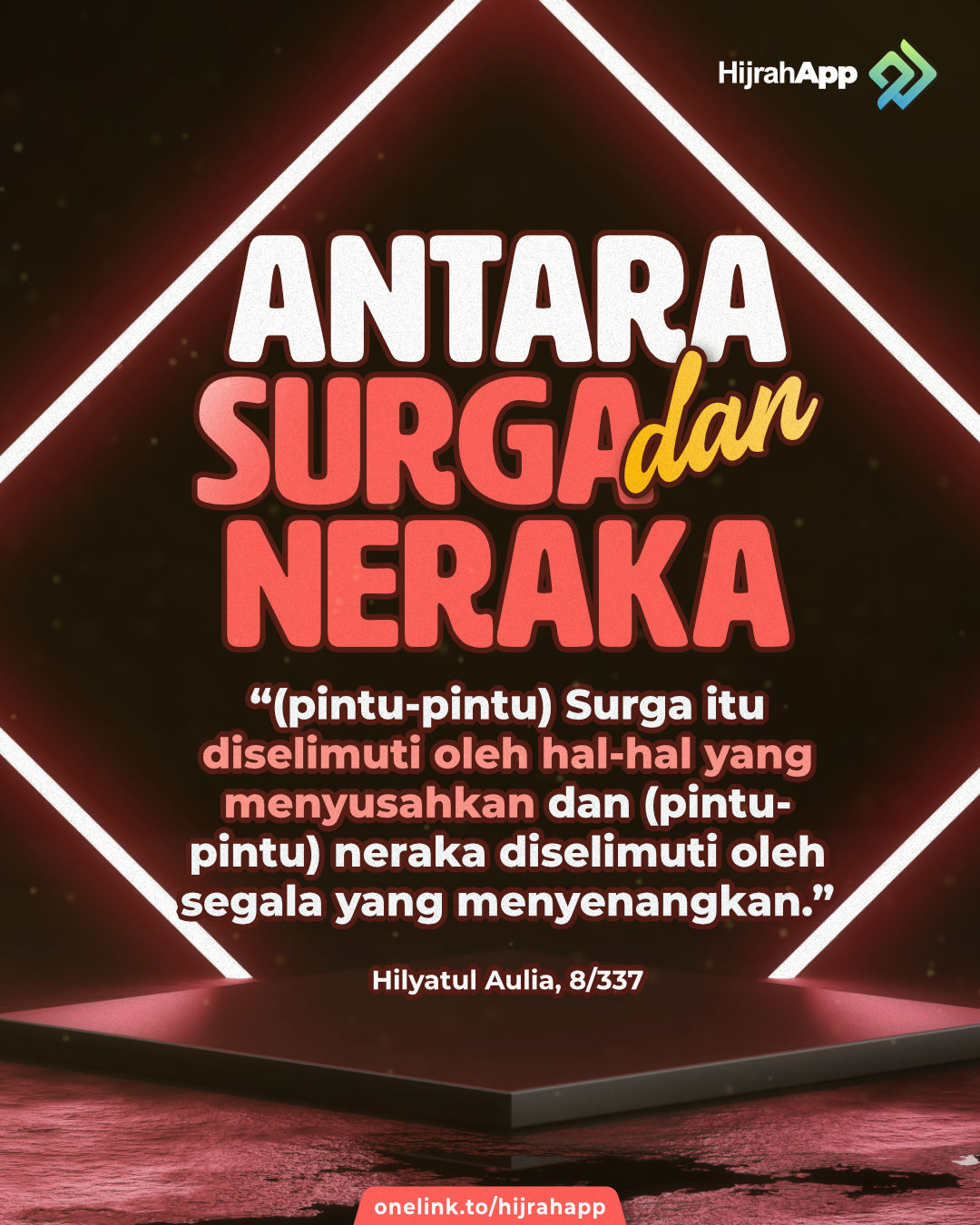 “(pintu-pintu) Surga itu diselimuti oleh hal-hal yang menyusahkan dan (pintu-pintu) neraka diselimuti oleh segala yang menyenangkan.” (Muttafaqun ‘alaih)