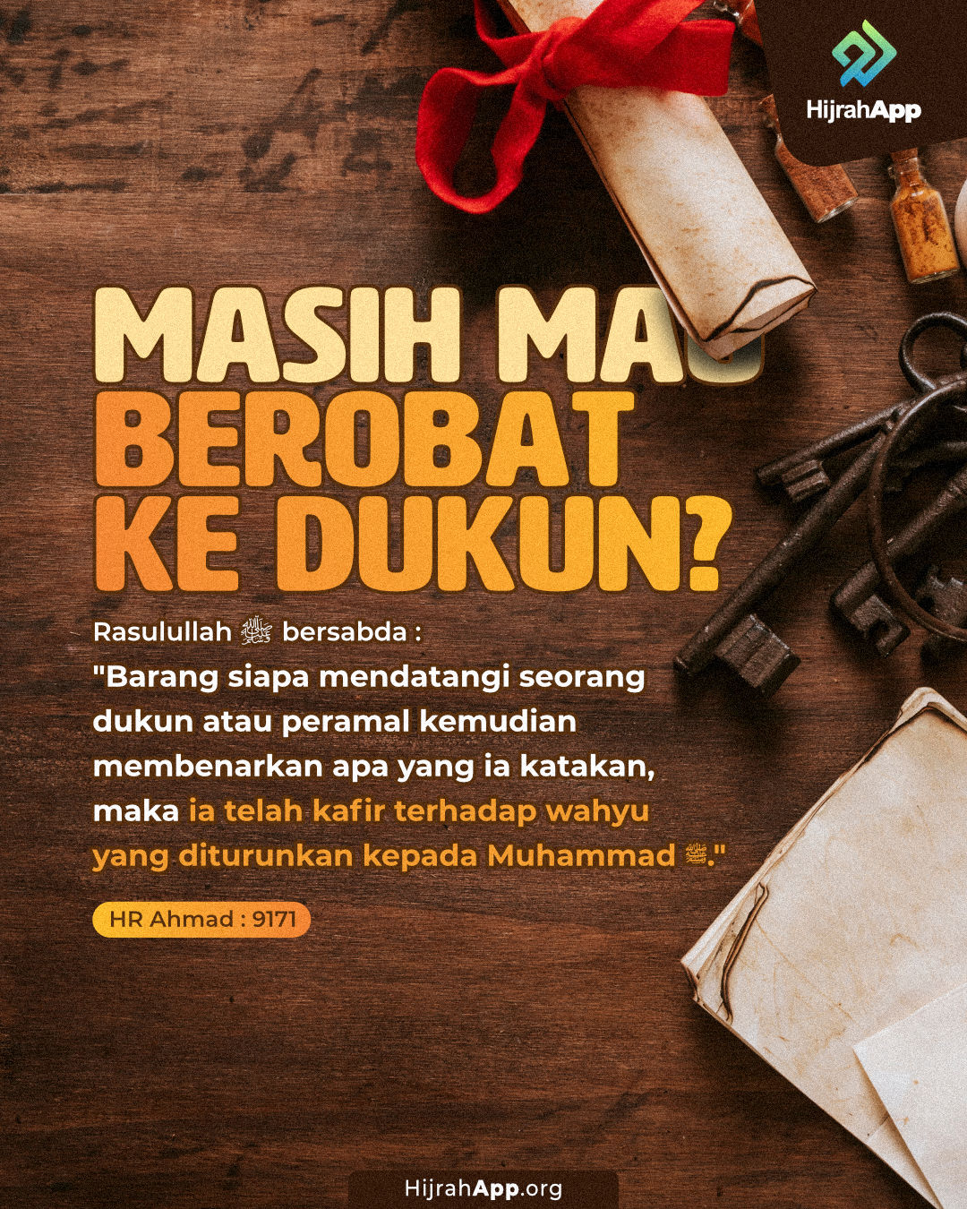 “Barangsiapa mendatangi dukun lalu memercayai apa yang dia katakan, maka dia telah kafir dengan apa yang diturunkan kepada Muhammad  ‘Alaihi shallaatu wasallam” (HR. Abu Dawud no. 3904, at Timidzi no. 135, an Nasai dalam as-Sunan al-Kubra no. 9017, Ibnu Majah no. 639, Ahmad no. 10167, dinilai sahih oleh Syaikh Al Albani).