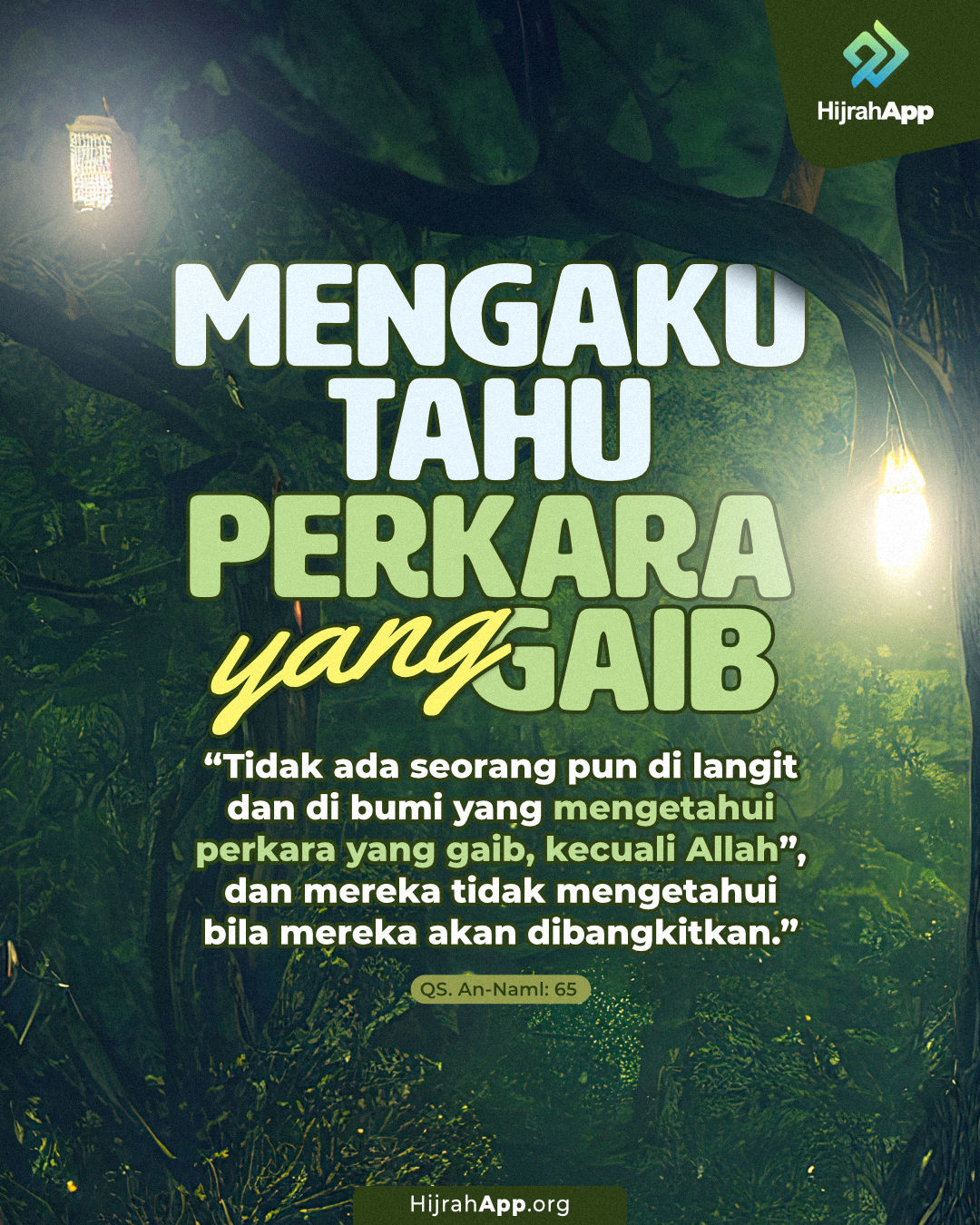 “Katakanlah, ‘Tidak ada seorang pun di langit dan di bumi yang mengetahui perkara yang ghaib kecuali Allah’” (QS. An Naml: 65)