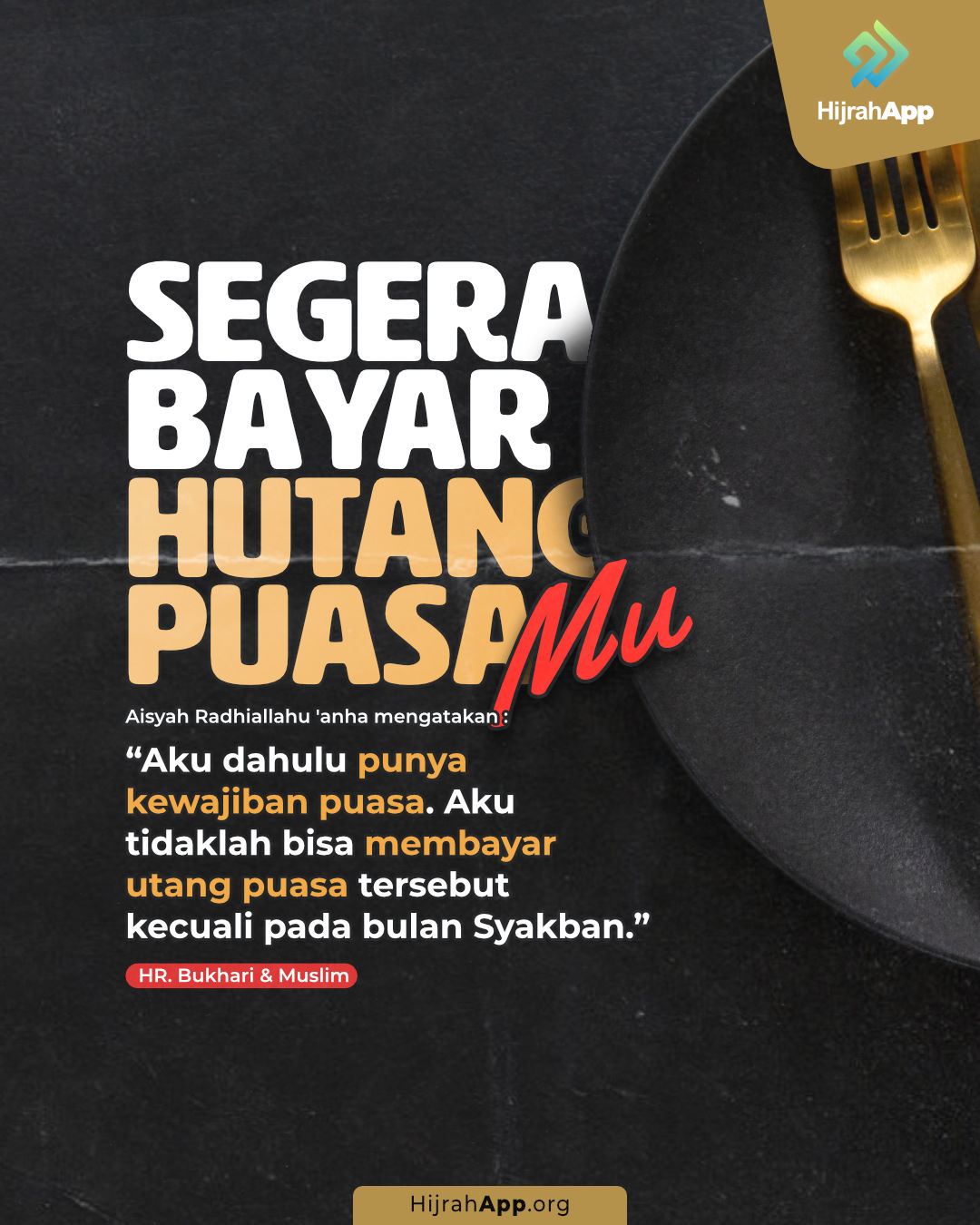 “Aku masih memiliki utang puasa Ramadhan. Aku tidaklah mampu mengqodho’nya kecuali di bulan Sya’ban.” Yahya (salah satu perowi hadits) mengatakan bahwa hal ini dilakukan ‘Aisyah karena beliau sibuk mengurus Nabi shallallahu ‘alaihi wa sallam.[8]