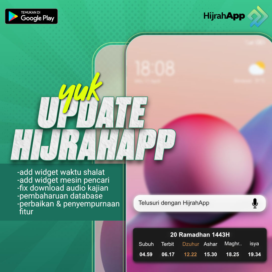 catatan: update baru tersedia untuk android. silahkan update hijrahapp langsung dari google playstore, jika opsi update tidak tampil, bersihkan cache google playstore dengan cara; buka pengaturan aplikasi hp >> pilih kelola aplikasi >> pilih google playstore >> kemudian pilih opsi hapus cache. kemudian cari ulang aplikasi hijrahapp di playstore atau ketuk > link update