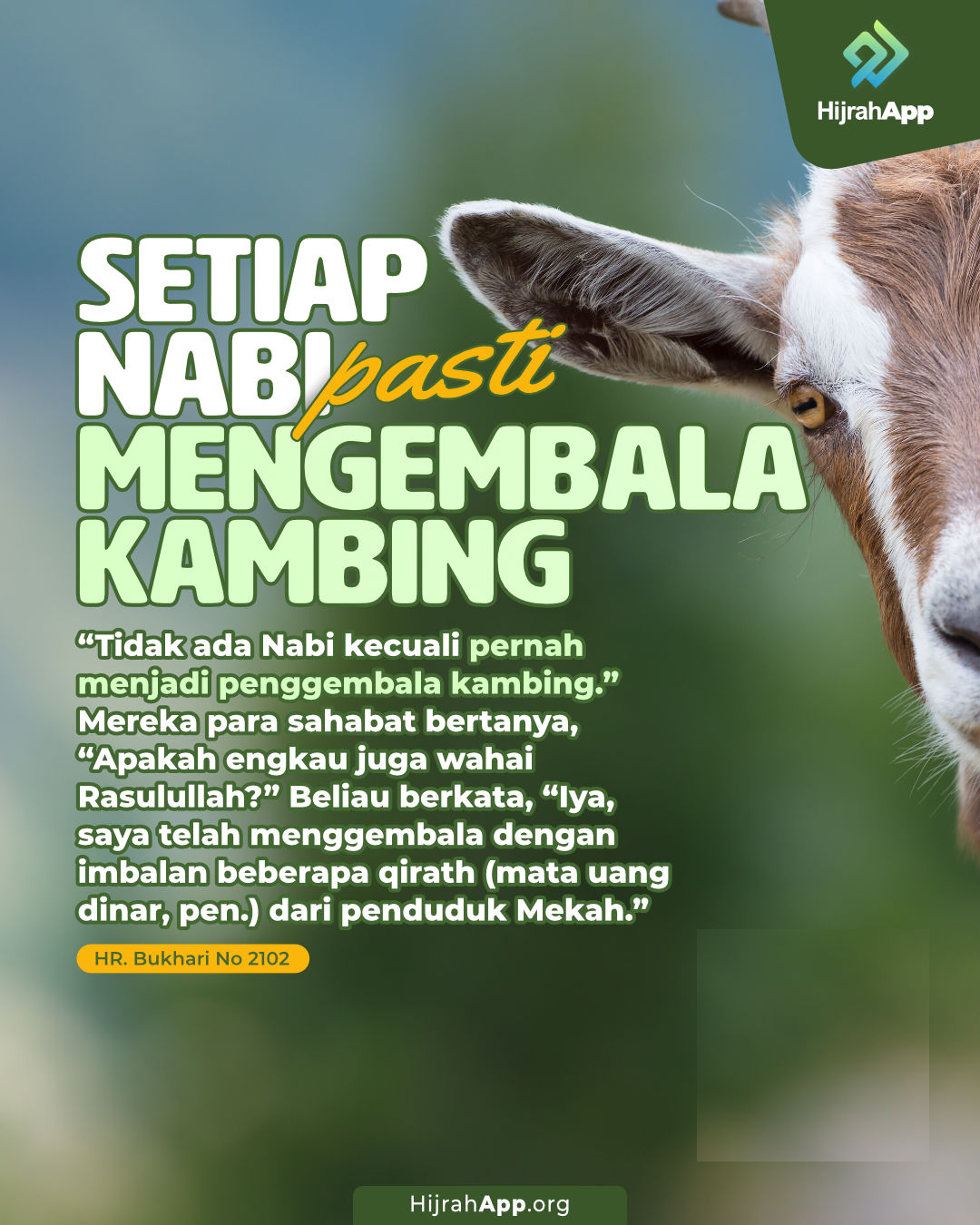 “Tidak ada Nabi kecuali pernah menjadi penggembala kambing.” Mereka para sahabat bertanya, “Apakah engkau juga wahai Rasulullah?” Beliau berkata, “Iya, saya telah menggembala dengan imbalan beberapa qirath (mata uang dinar, pen.) dari penduduk Mekah.” (HR. Bukhari, no. 2262)
