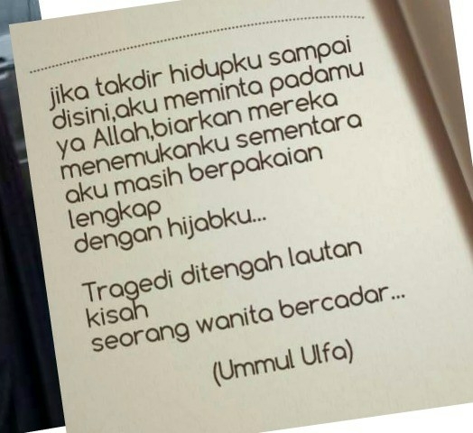 “Jika takdir hidupku sampai di sini saja, aku meminta padaMU ya Allah…biarkan mereka menemukanku sementara aku masih berpakaian lengkap dengan hijabku…”