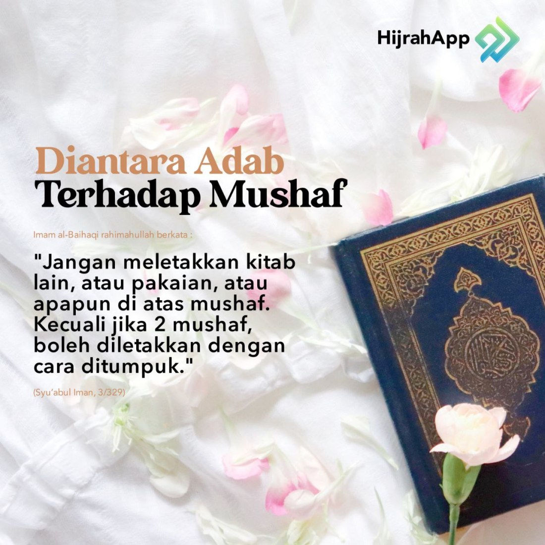 Jangan meletakkan kitab lain, atau pakaian, atau apapun di atas mushaf. Kecuali jika 2 mushaf, boleh diletakkan dengan cara ditumpuk. (Syu’abul Iman, 3/329).