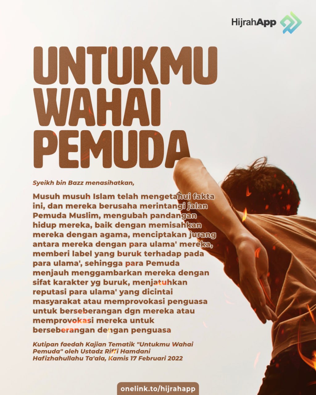 Semoga nasihat untuk pemuda ini bisa bermanfaat untuk kita semua. Kami memohon kepada Allah Ta’ala untuk memperbaiki kondisi umat Islam, dan memberikan petunjuk kepada para pemudanya untuk beramal yang diridhai Rabb-nya dan menjadikan mereka sebagai petunjuk yang menerangi (jalan kebenaran). Wallahu a’lam.