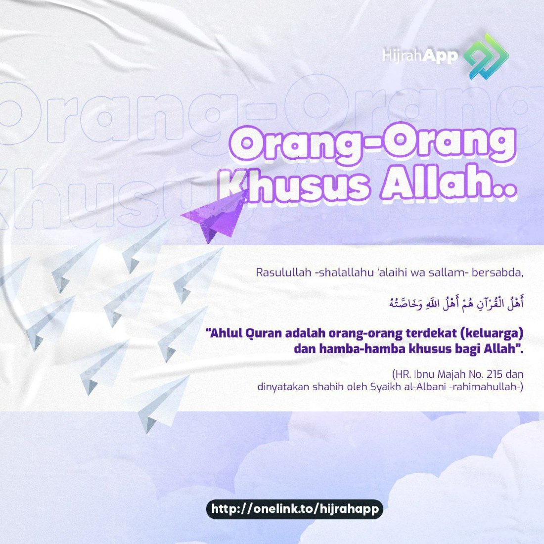 “Sesungguhnya Allah memiliki orang khusus (Ahliyyin) dari kalangan manusia. Mereka (para shahabat) bertanya, “Wahai Rasulullah siapakah mereka?” Beliau menjawab, “Mereka adalah Ahlu Al-Qur’an, Ahlullah dan orang khusus-Nya.” Dishahihkan oleh Al-Albany dalam Shahih Ibnu Majah)