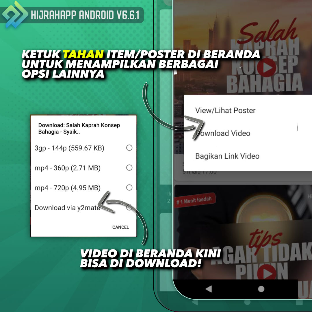 berbeda dengan channel kajian yang hanya menampilkan video per channel, di HijrahTube tim menampilkan video kajian dari berbagai channel dakwah dalam 1 tampilan. dan juga kini hanya butuh 1x ketukan untuk memutar video. namun tenang, kami tidak menghilangkan fitur download video pada halaman deskripsi. kini antum dapat membuka opsi download video dll dengan cara ketuk tahan pada video yang ingin antum download.