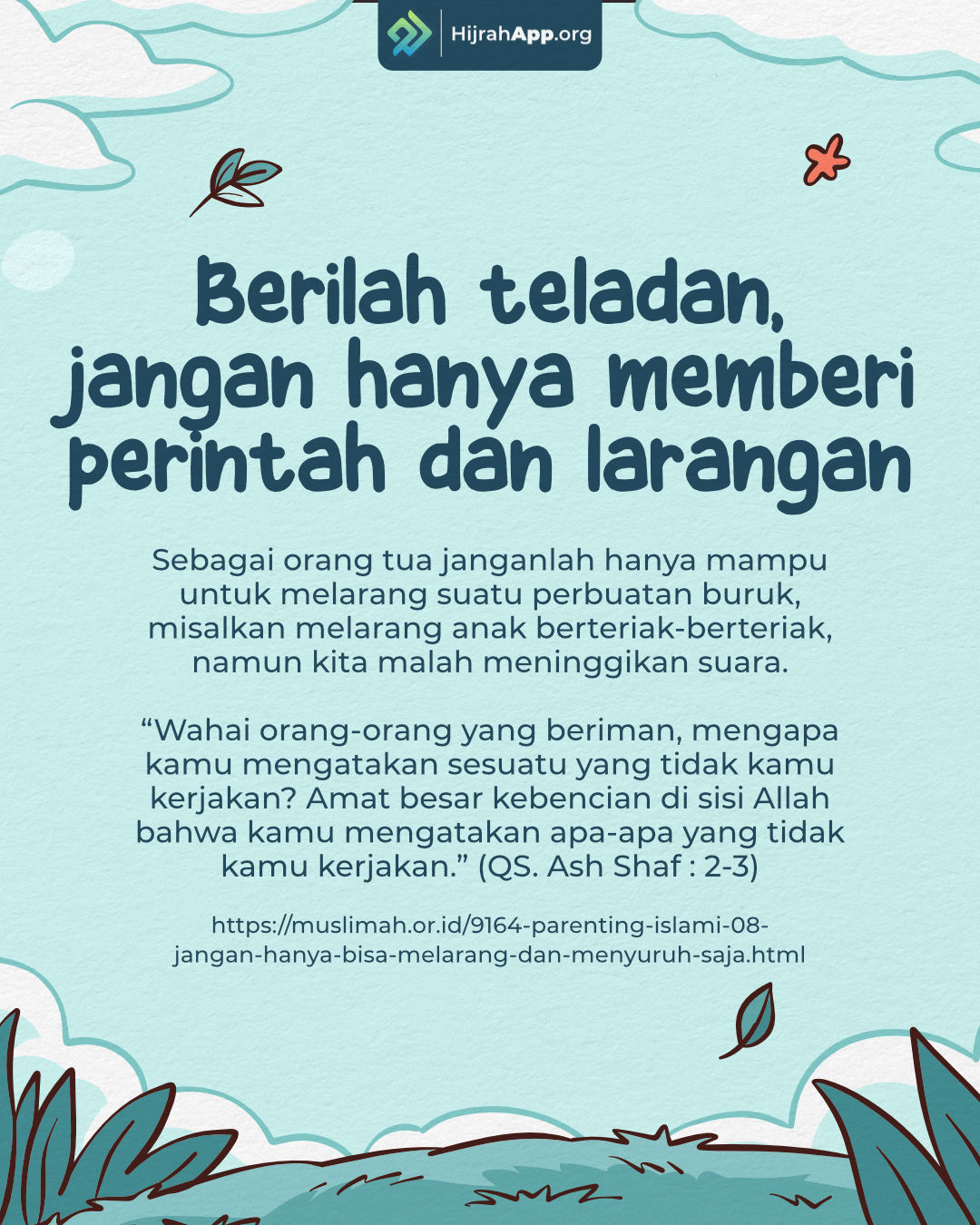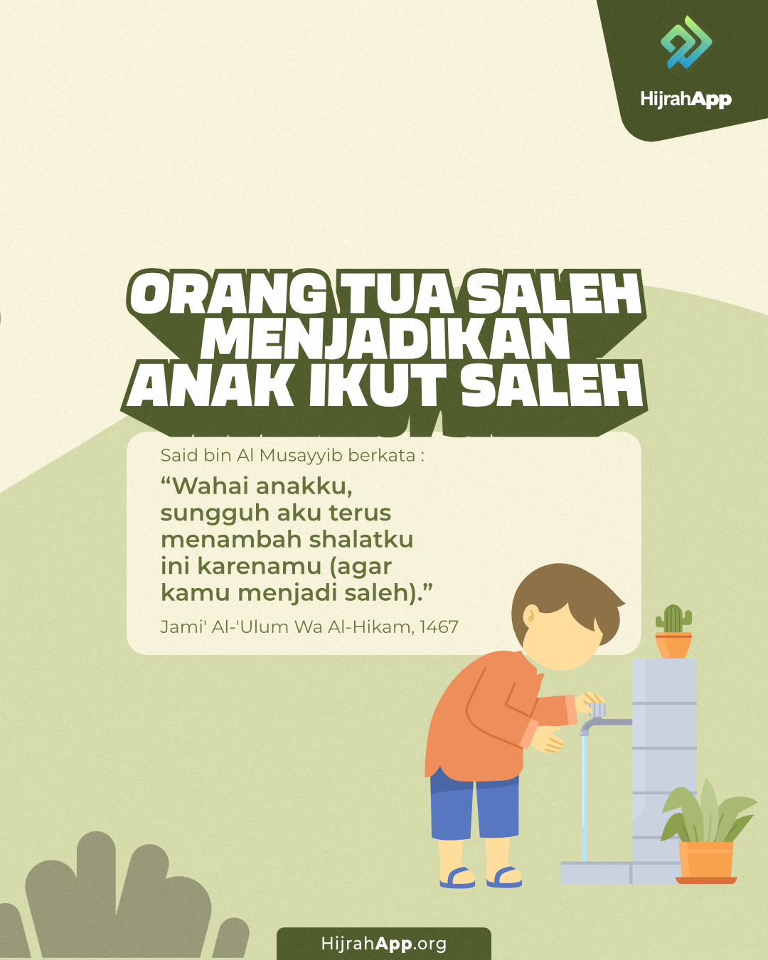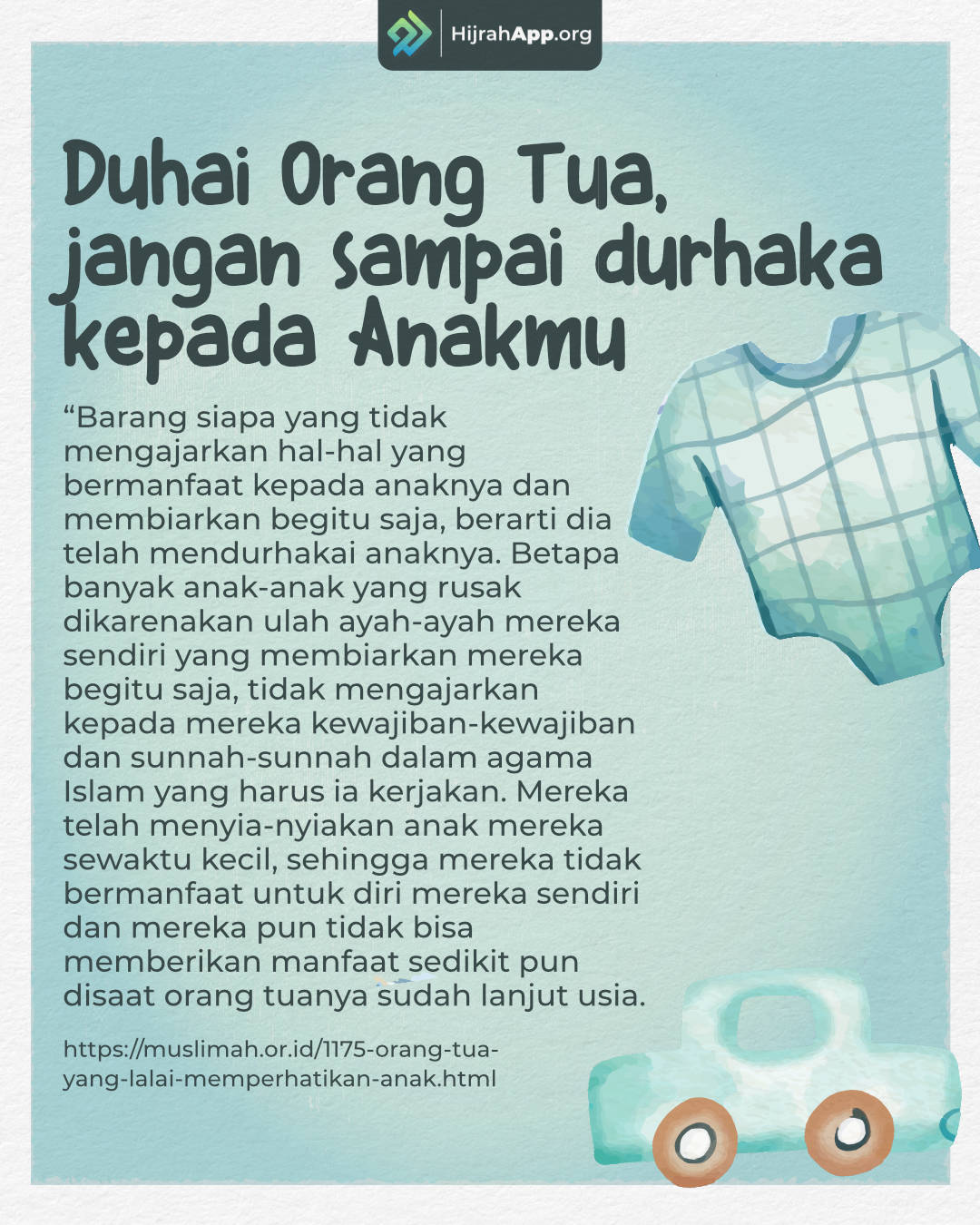 “Hendaknya perbaikan pertama pada diri anak saya adalah perbaikan dirimu sendiri, karena pandangannya tertuju kepadamu. Yang baik menurut mereka adalah apa yang engkau perbuat dan yang jelek bagi mereka adalah apa yang engkau tinggalkan. Ajari mereka Kitabullah dan jangan dipaksa sehingga ia menjadi bosan serta jangan engkau tinggalkan mereka tidak mempelajari Kitabullah sehingga mereka meninggalkannya.Kemudianajarkan syair yang menjaga ‘iffah, haditsyang paling pentingserta jangan engkau pindahkan ia ke ilmu lain sampai dia mahir terlebih dahulu, karena banyaknya perkataan dalam pendengaran berakibat besar membuat tidak paham.” (Dikeluarkan oleh Abu Utsman al-Jahizh dalam “al-Bayan wa at-Tabyin” 2/35-36 dan Ibnu Abi ad-Dunya dalam “al-‘Iyal” 1/470)