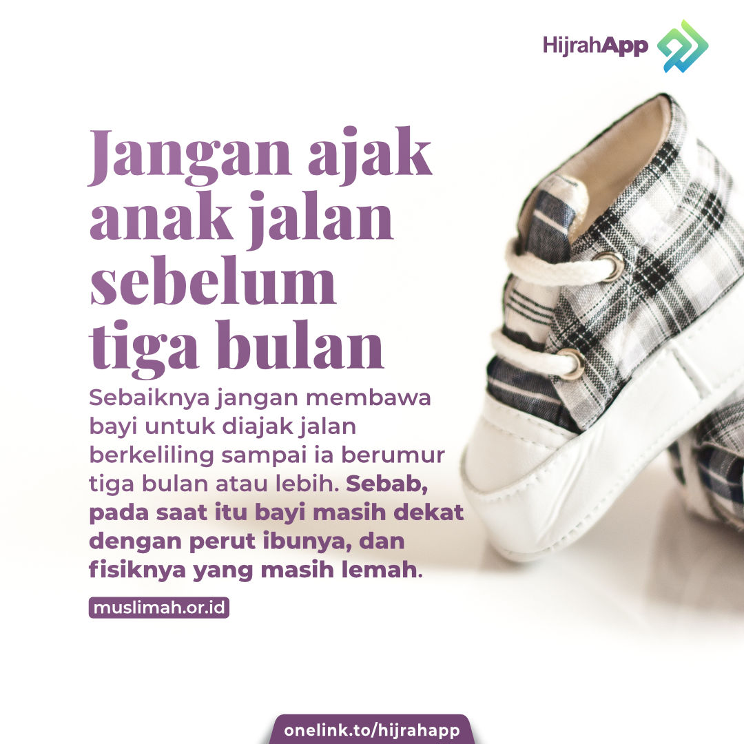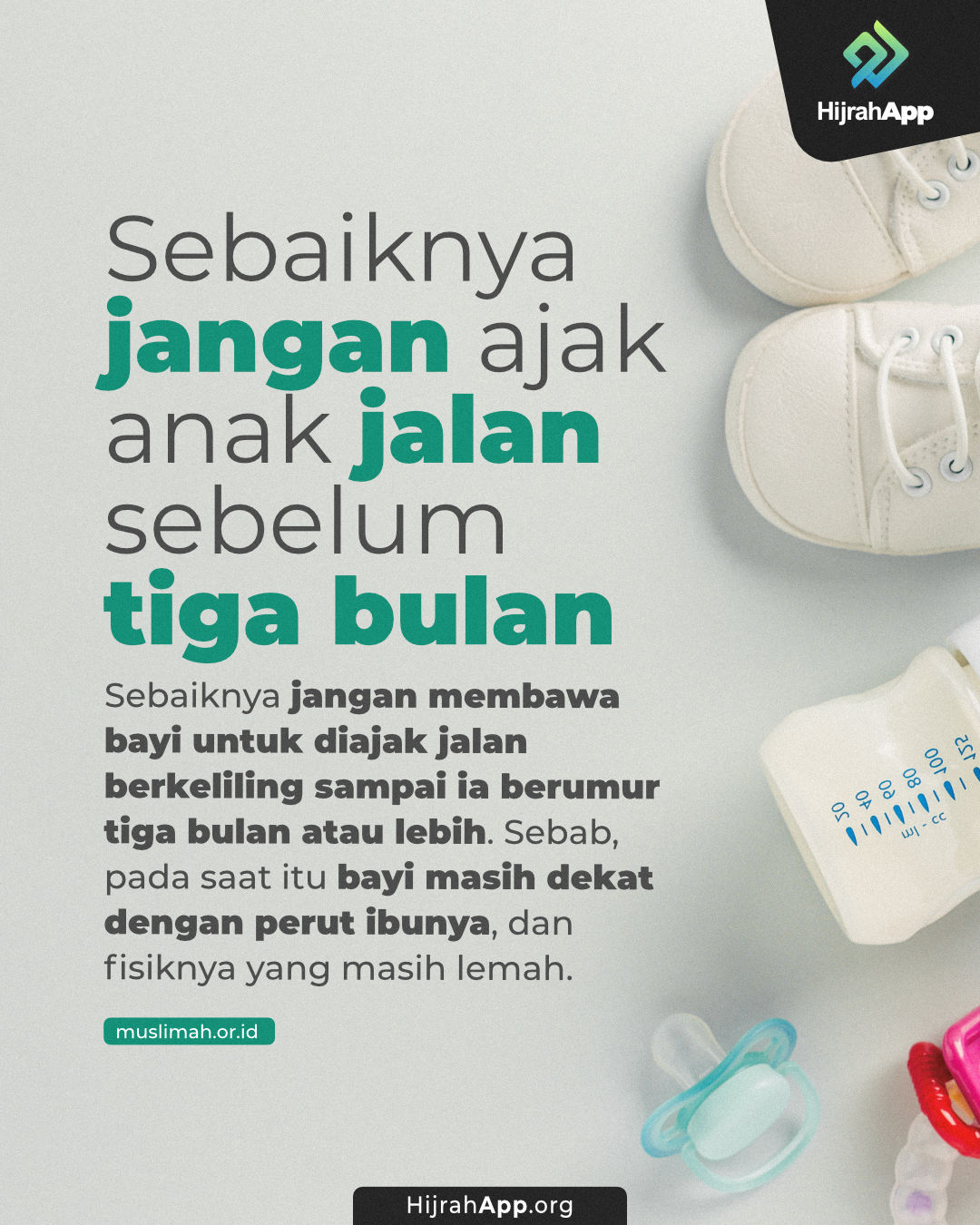Sebaiknya jangan membawa bayi untuk diajak jalan berkeliling sampai ia berumur tiga bulan atau lebih. Sebab, pada saat itu bayi masih dekat dengan perut ibunya, dan fisiknya yang masih lemah.