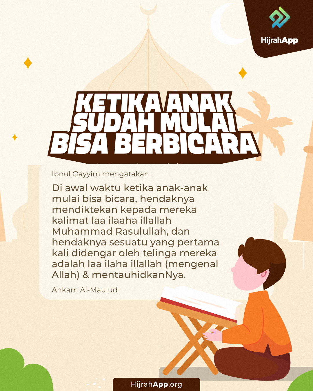 “Diawal waktu ketika anak-anak mulai bisa bicara, hendaknya mendiktekan kepada mereka kalimat laa ilaaha illallah Muhammad Rasulullah, & hendaknya sesuatu yang pertama kali didengar oleh telinga mereka adalah laa ilaha illallah (mengenal Allah) & mentauhidkanNya. Juga diajarkan kepada mereka bahwa Allah bersemayam di atas singgasanaNya yang senantiasa melihat & mendengar perkataaan mereka, senantiasa bersama mereka dimanapun mereka berada.” (Ahkam Al-Maulud)