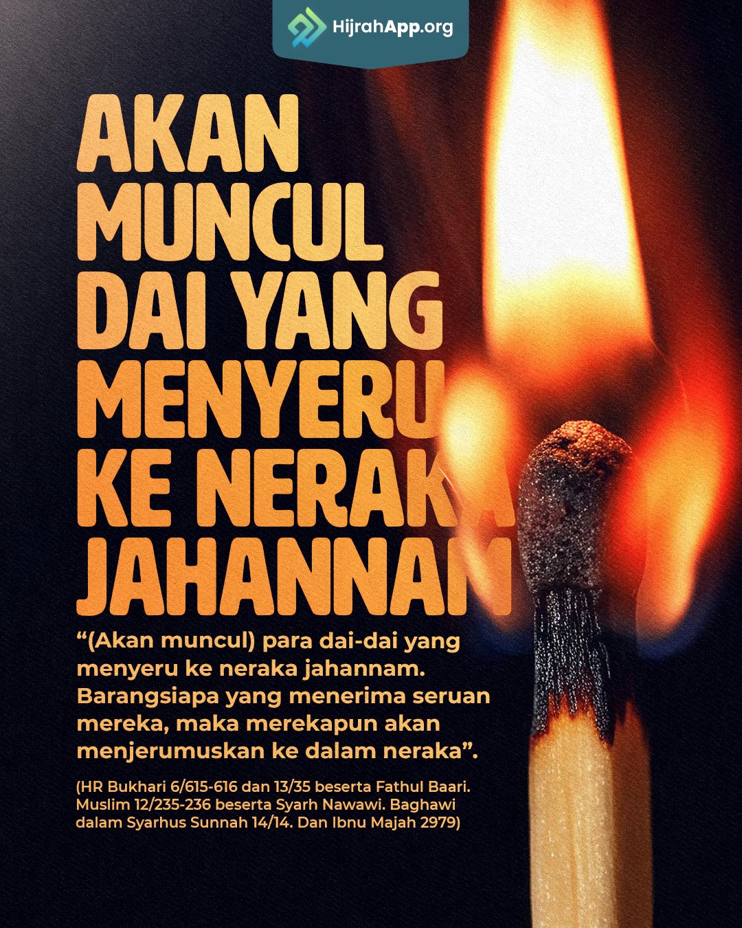 “Akan muncul dai-dai yang menyeru ke neraka jahannam, barangsiapa yang menerima seruan mereka maka mereka akan menjerumuskannya ke dalam jahannam”. Hudzaifah bertanya : “Wahai Rasululah sebutkan cirri mereka ?” Rasulullah menjawab : “Mereka dari golongan kita dan berbicara dengan lisan-lisan kita”.