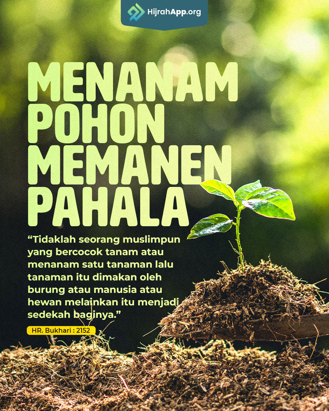 “Tidaklah seorang muslim pun yang bercocok tanam atau menanam satu tanaman, lalu tanaman itu dimakan oleh burung, atau manusia, atau hewan, melainkan itu menjadi sedekah baginya.” (HR. Bukhari)