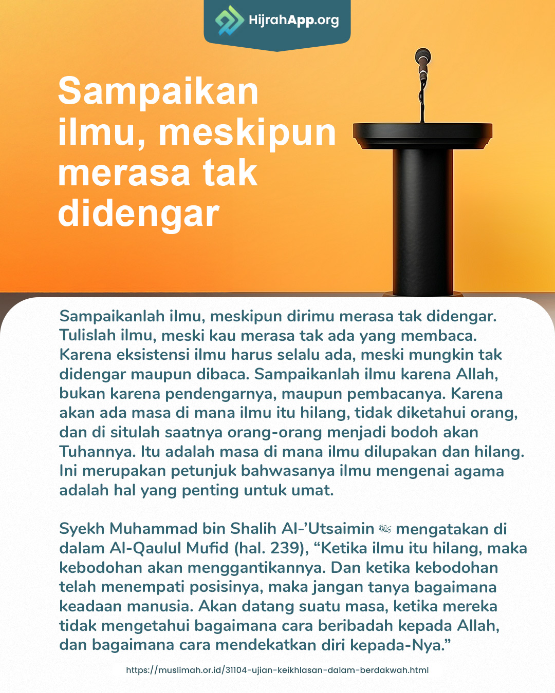 Sampaikanlah ilmu, meskipun dirimu merasa tak didengar. Tulislah ilmu, meski kau merasa tak ada yang membaca. Karena eksistensi ilmu harus selalu ada, meski mungkin tak didengar maupun dibaca. Sampaikanlah ilmu karena Allah, bukan karena pendengarnya, maupun pembacanya. Karena akan ada masa di mana ilmu itu hilang, tidak diketahui orang, dan di situlah saatnya orang-orang menjadi bodoh akan Tuhannya. Itu adalah masa di mana ilmu dilupakan dan hilang. Ini merupakan petunjuk bahwasanya ilmu mengenai agama adalah hal yang penting untuk umat.