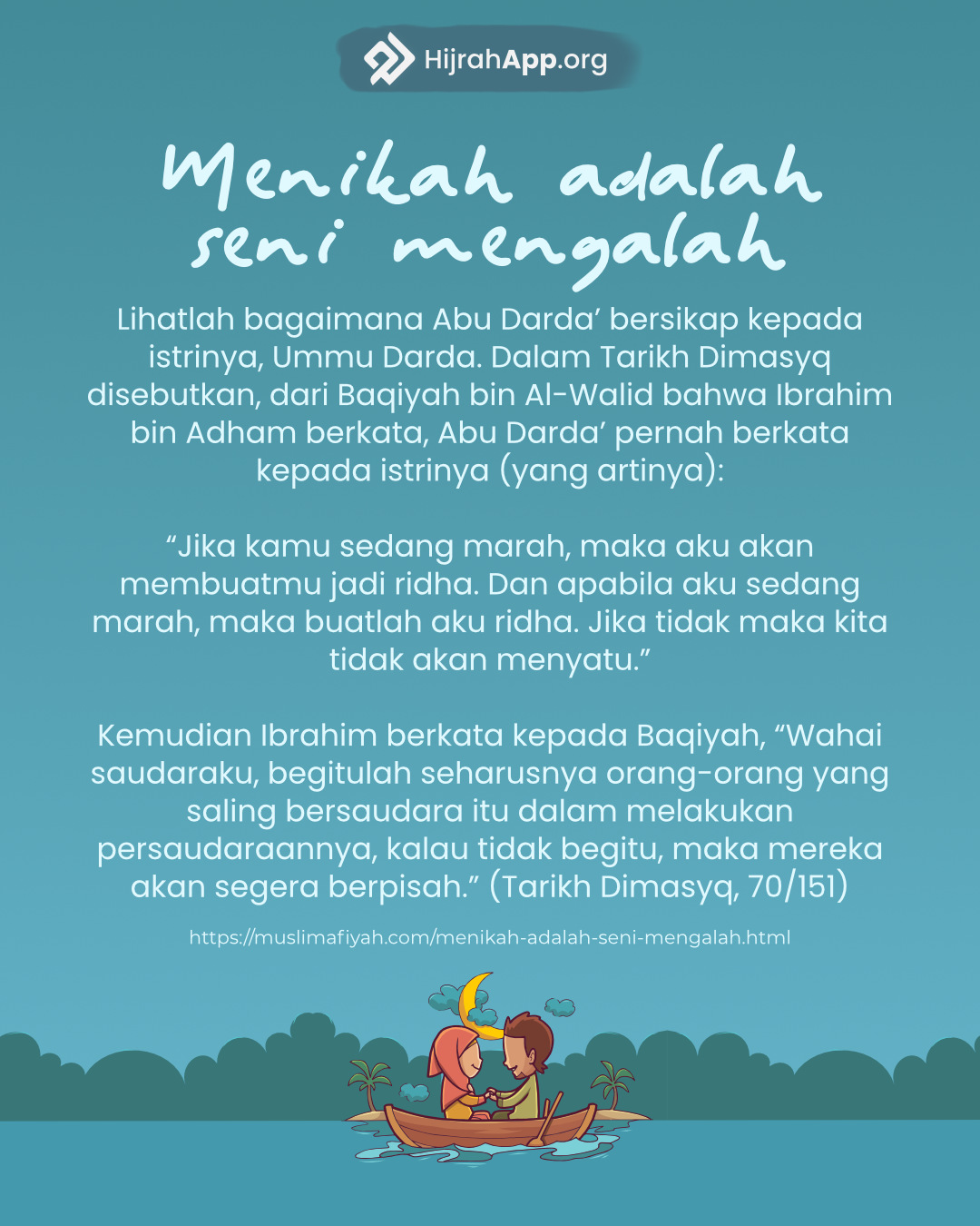“Kekasihku (Rasulullah) shallallahu ‘alaihi wa sallam berwasiat kepadaku dengan tujuh hal: (1) supaya aku mencintai orang-orang miskin dan dekat dengan mereka, (2) beliau memerintahkan aku agar aku melihat kepada orang yang berada di bawahku dan tidak melihat kepada orang yang berada di atasku, (3) beliau memerintahkan agar aku menyambung silaturahmiku meskipun mereka berlaku kasar kepadaku, (4) aku dianjurkan agar memperbanyak ucapan laa hawla wa laa quwwata illa billah (tidak ada daya dan upaya kecuali dengan pertolongan Allah), (5) aku diperintah untuk mengatakan kebenaran meskipun pahit, (6) beliau berwasiat agar aku tidak takut celaan orang yang mencela dalam berdakwah kepada Allah, dan (7) beliau menasehatiku agar tidak meminta-minta sesuatu pun kepada manusia” (HR. Ahmad 5: 159. Syaikh Syu’aib Al Arnauth mengatakan bahwa hadits ini shahih).