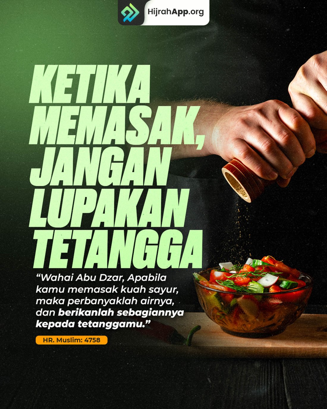 Dari Abū Dzarr radhiallahu ‘anhu, beliau berkata, “Rasulullah ﷺ bersabda, ‘Jika engkau memasak kuah, maka perbanyaklah airnya dan perhatikanlah tetangga-tetanggamu’.” ([1])