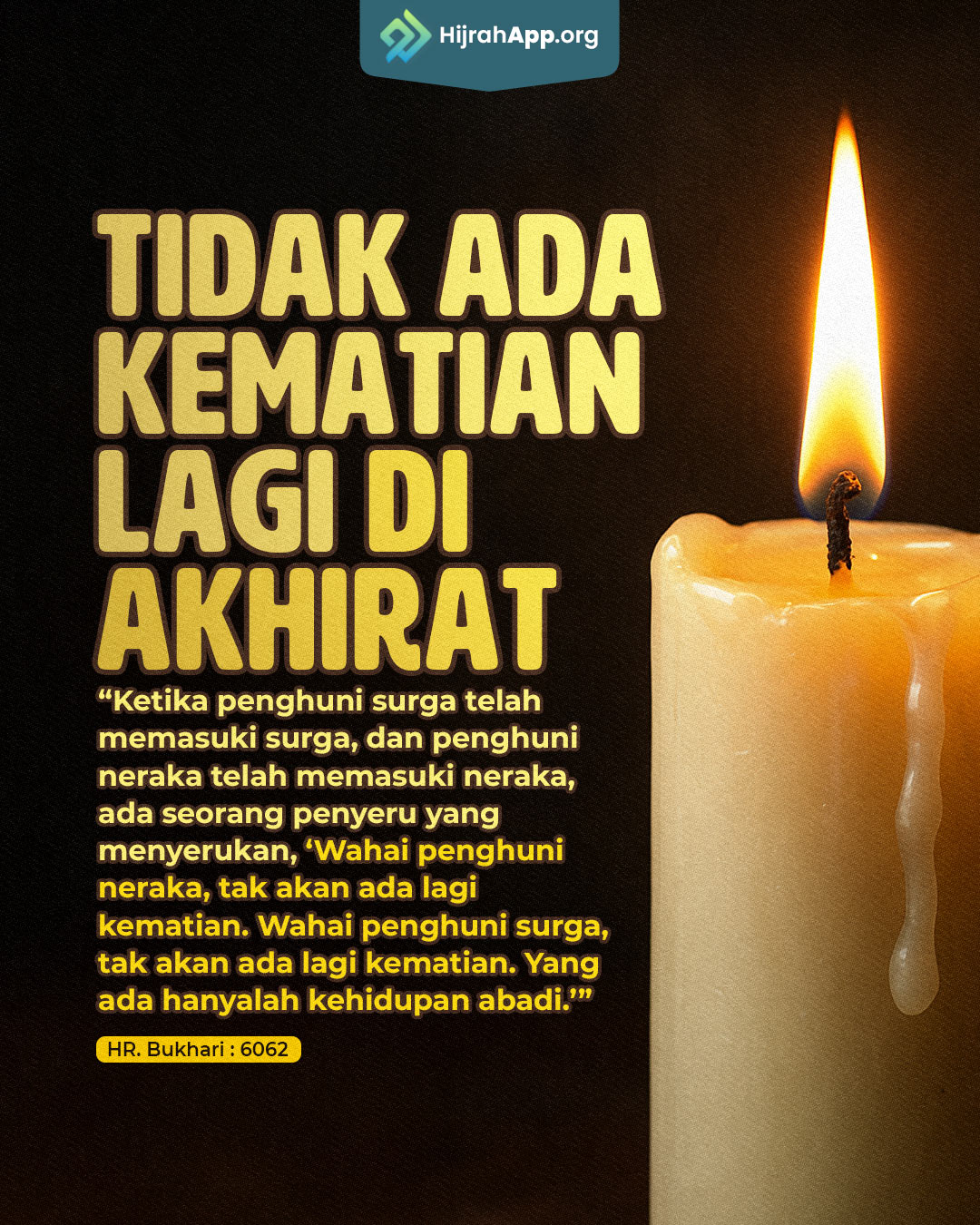 “…Wahai penghuni Surga, kalian kekal (selamanya) dan tidak akan mati. (Demikian pula kepada penghuni Neraka), Wahai penghuni Neraka kalian kekal dan tidak akan mati.”[1]